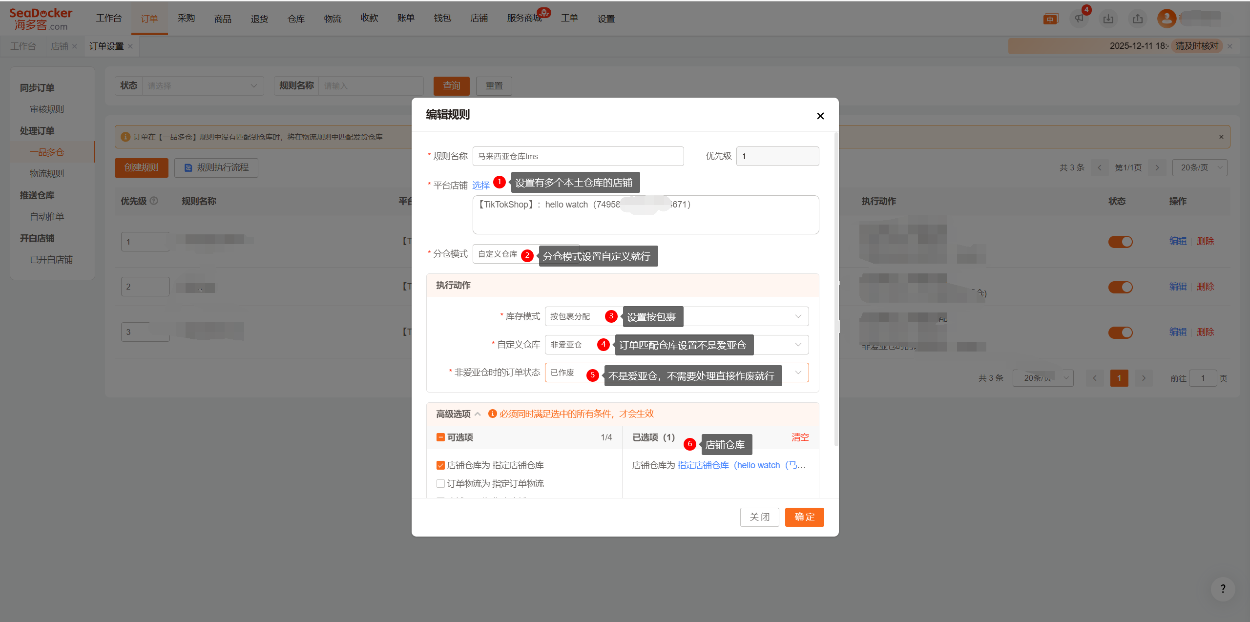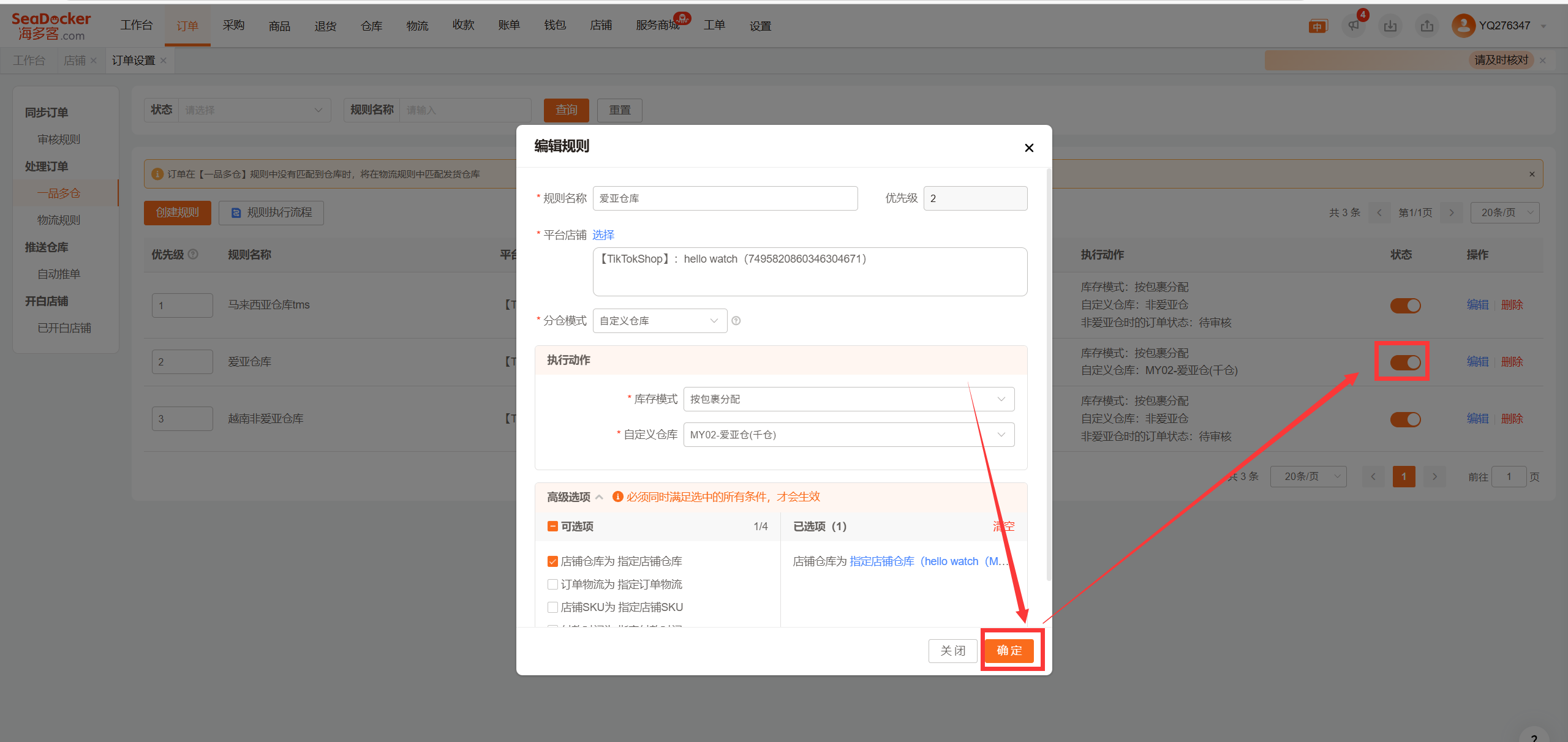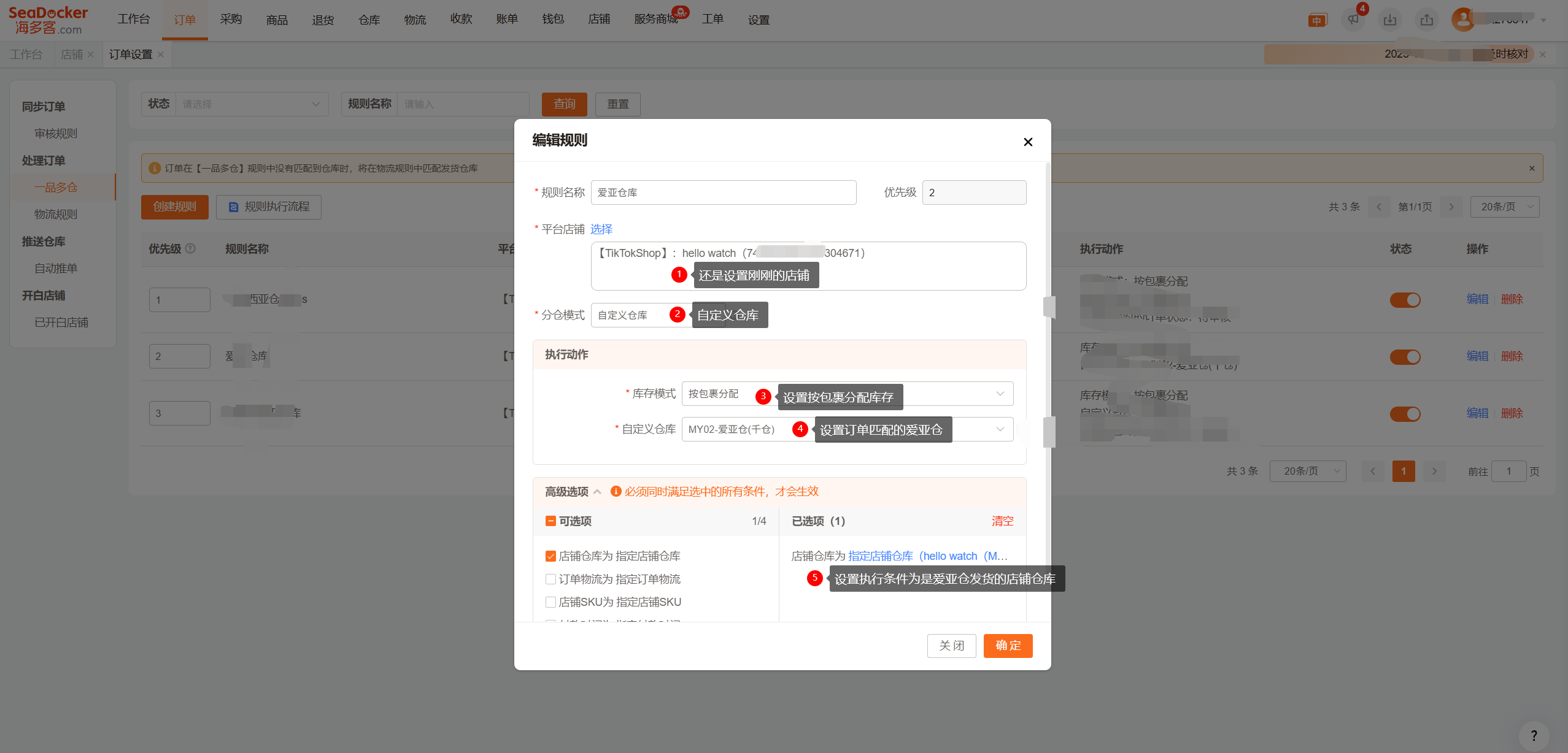 点击高级选项设置执行条件:指定店铺仓库“设置爱亚仓发货的仓库”