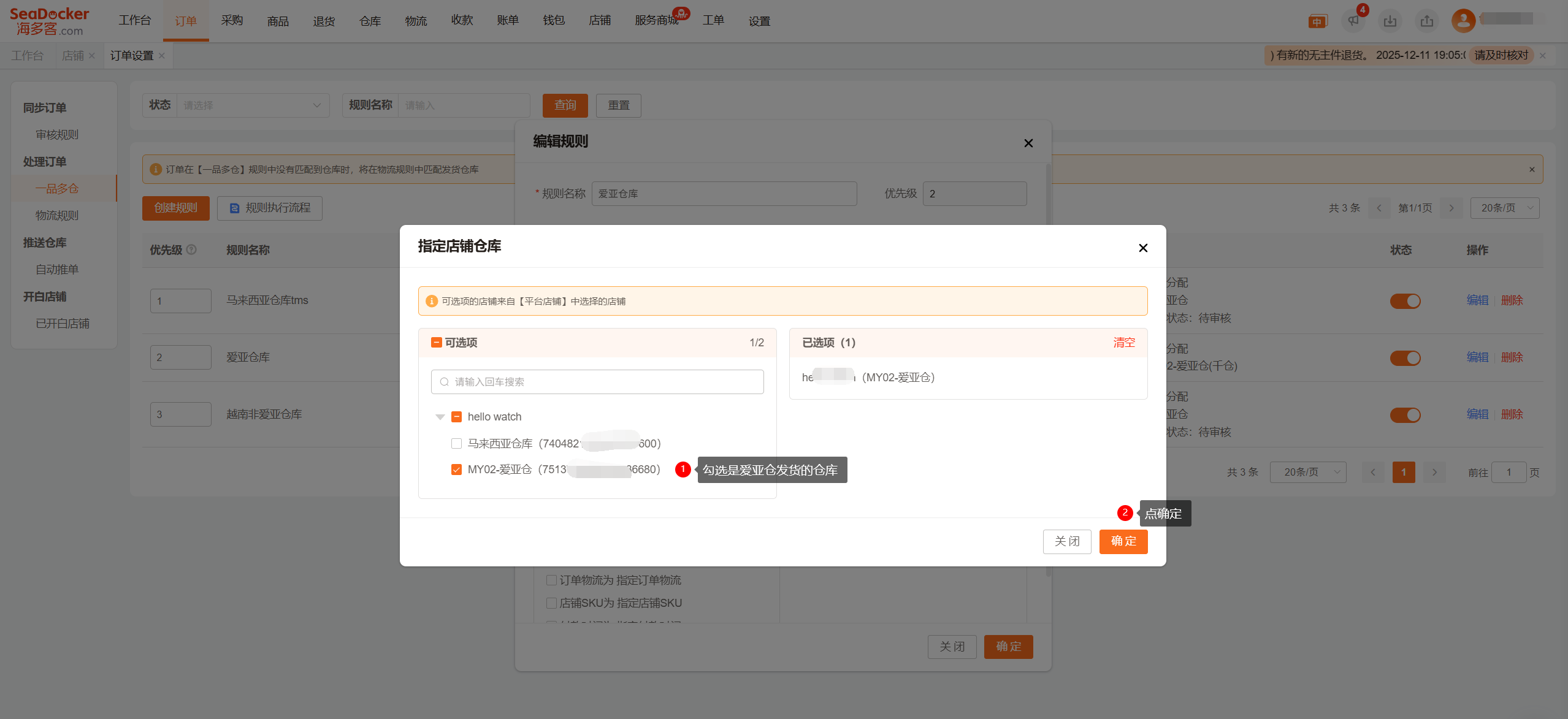 1、此规则适用于客户同一个店铺一个站点下面有2个或以上本土仓库情况,设置此规则后可以实现按照订单店铺仓库(店铺后台设置发货仓库)来匹配实际发货仓库(海多客里面的仓库)。2、一品多仓规则需要至少设置2条规则,一条规则设置是爱亚仓发货的订单,匹配爱亚仓发货;另一个规则设置不是爱亚仓的订单,直接设置订单状态为作废不处理(仅是海多客里面的状态改成作废,店铺后台状态不变),客户通过其它方式发货其它仓库的订单。