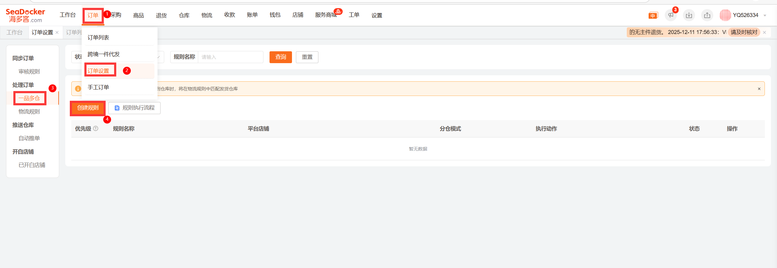 订单-订单设置-一品多仓-直接点击创建规则