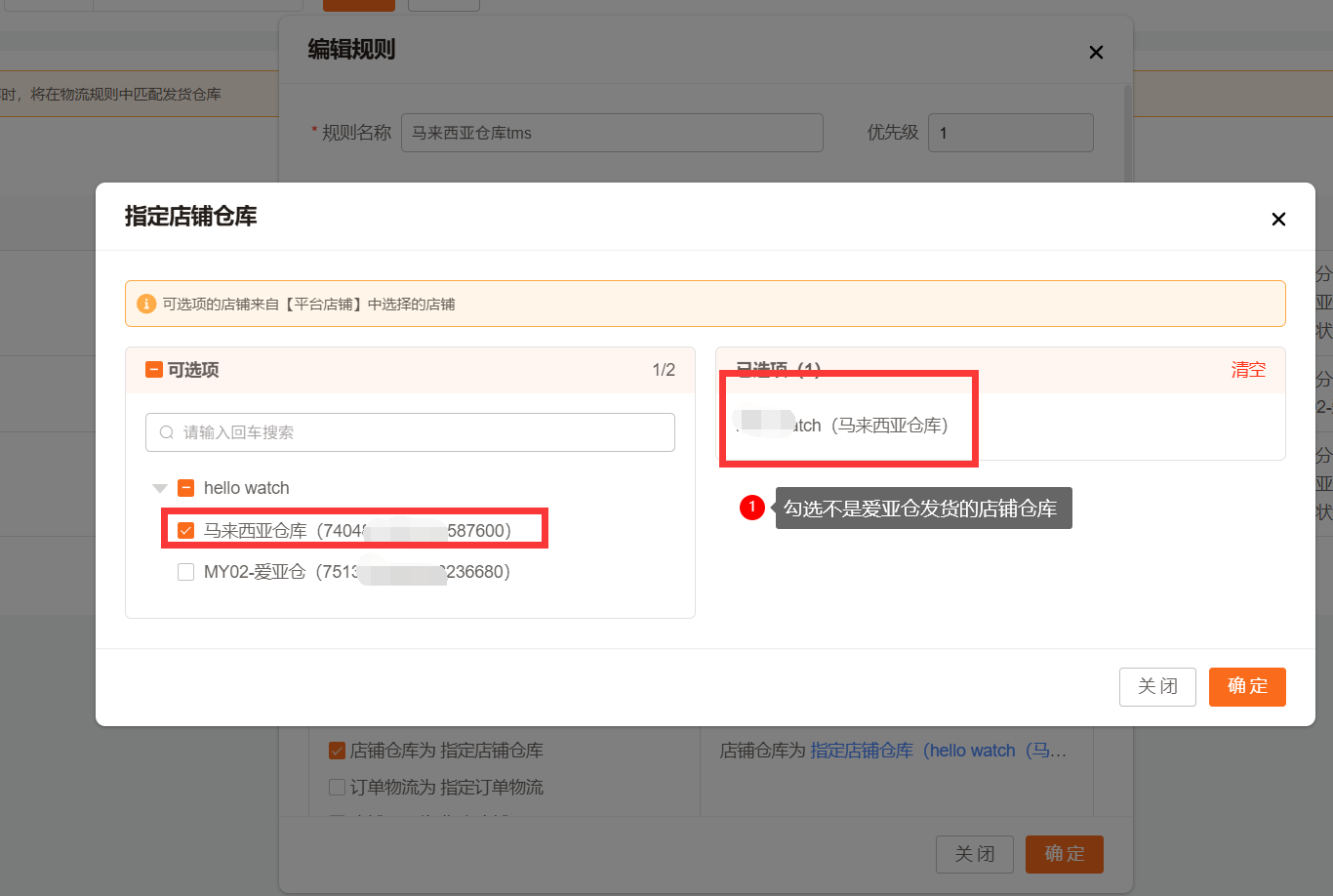 点击高级选项设置执行条件:指定店铺仓库“设置不是爱亚仓发货的仓库”