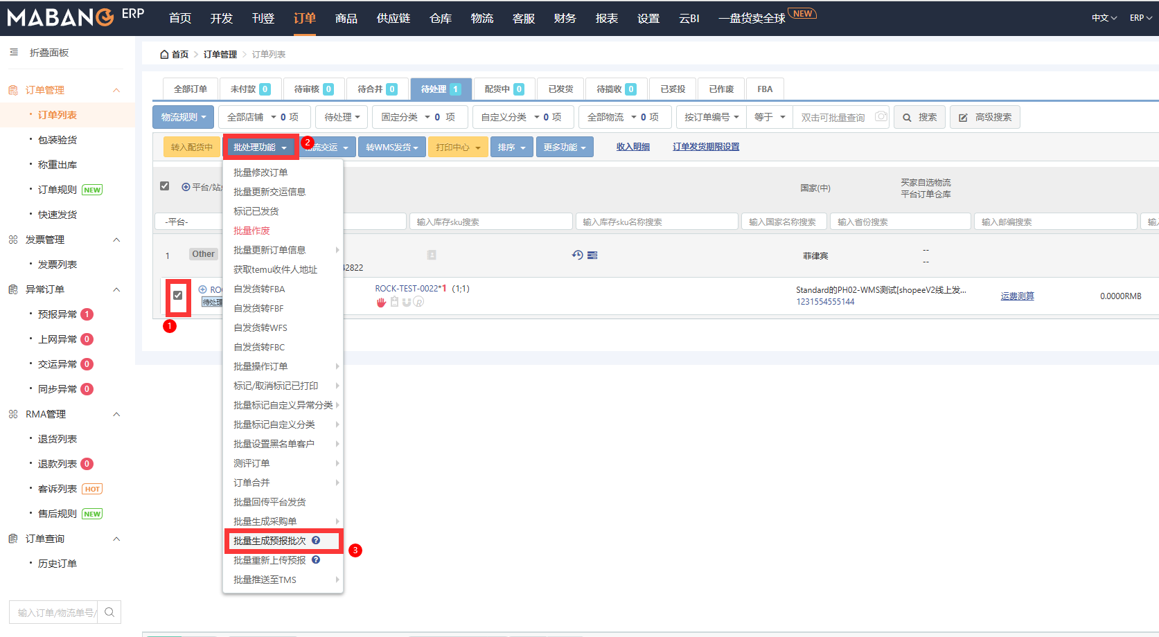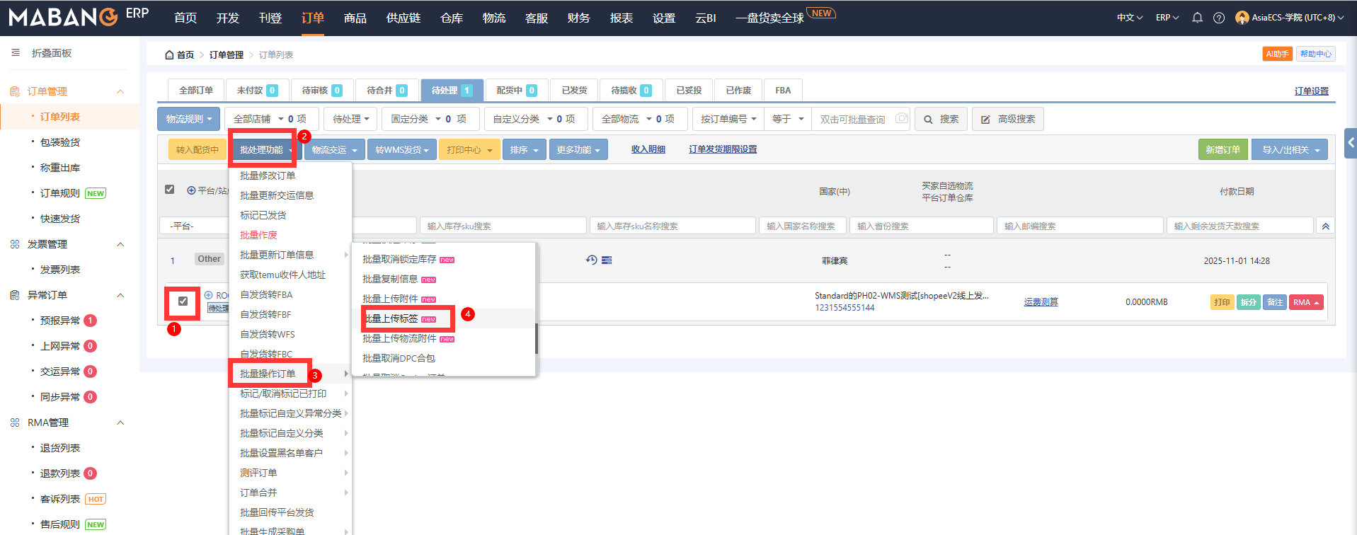 选择订单-点击批处理功能-点击批量操作订单-点击批量上传标签