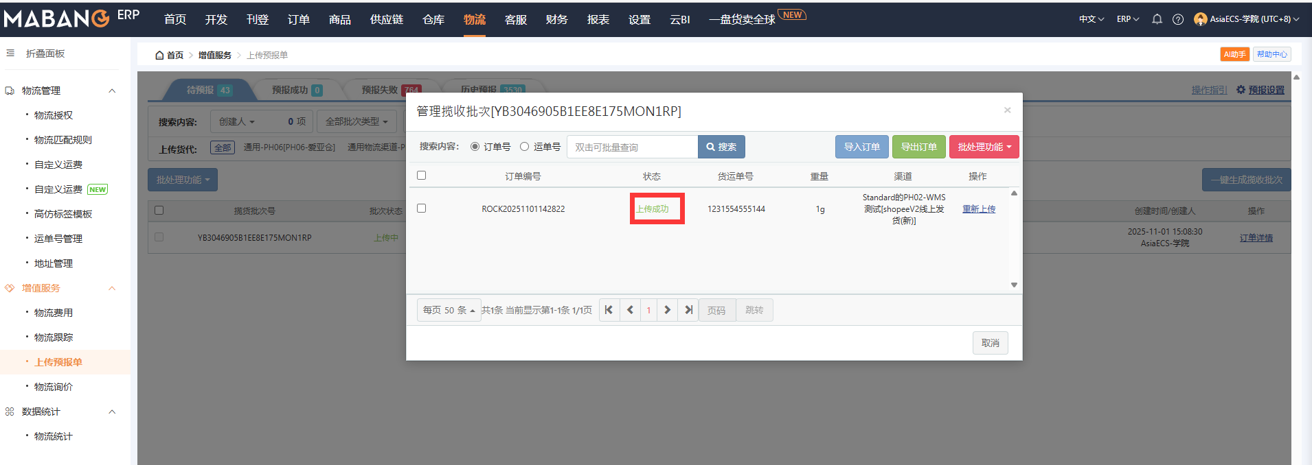 订单状态变成上传成功就说明订单已经正常下发仓库