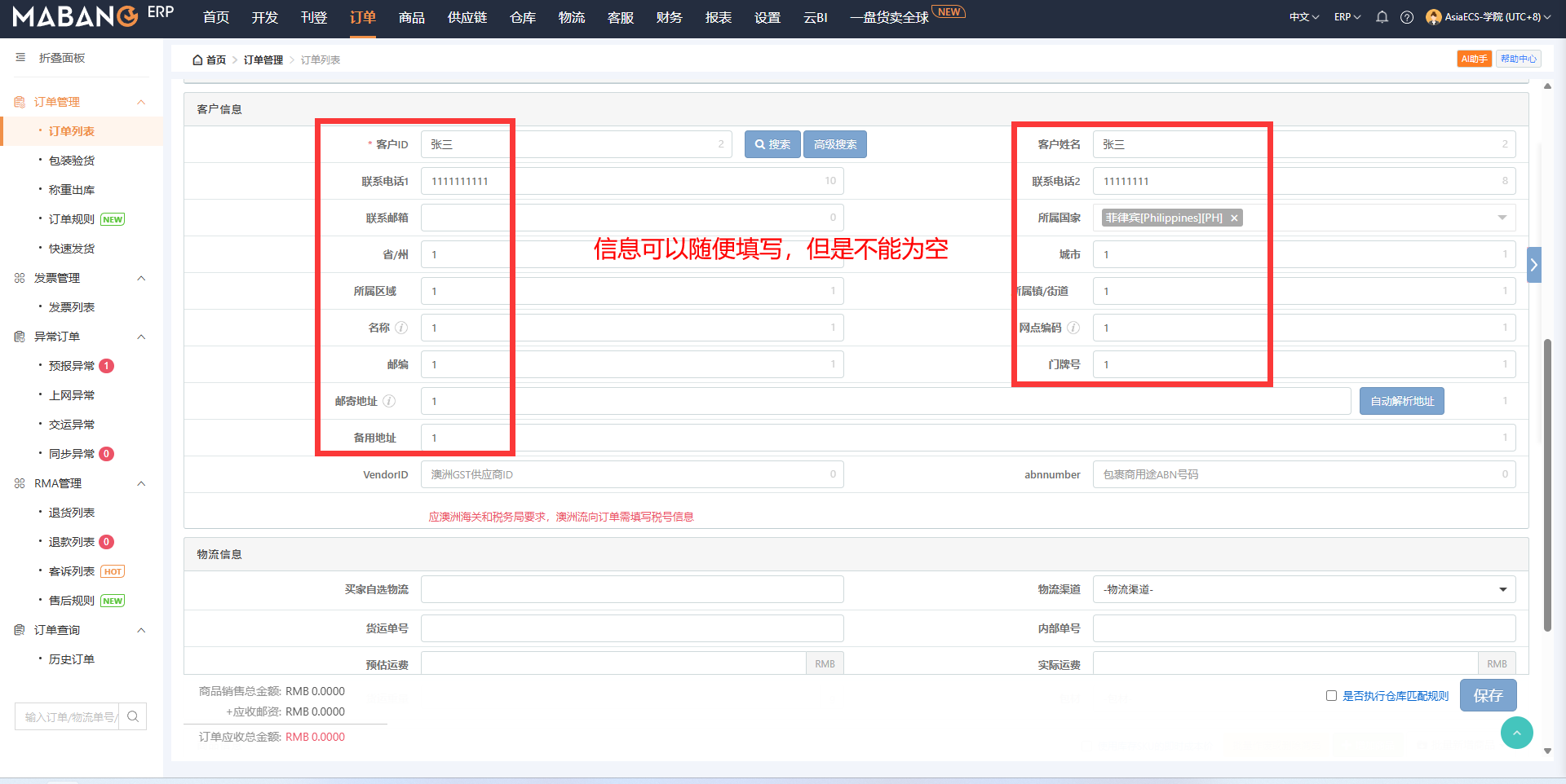 填写以下信息:因为订单是客户自己上传面单,地址信息可以随便填写但是,不能为空