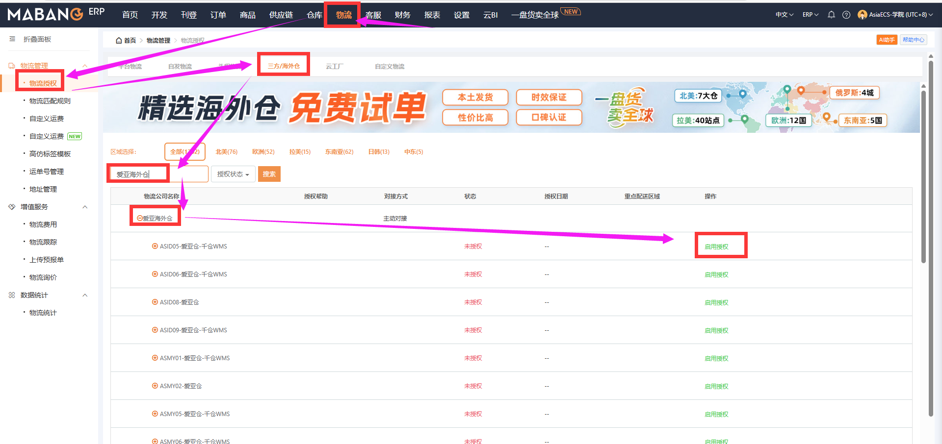 物流-物流授权-搜索爱亚海外仓-找到要授权的仓库-点击启用授权