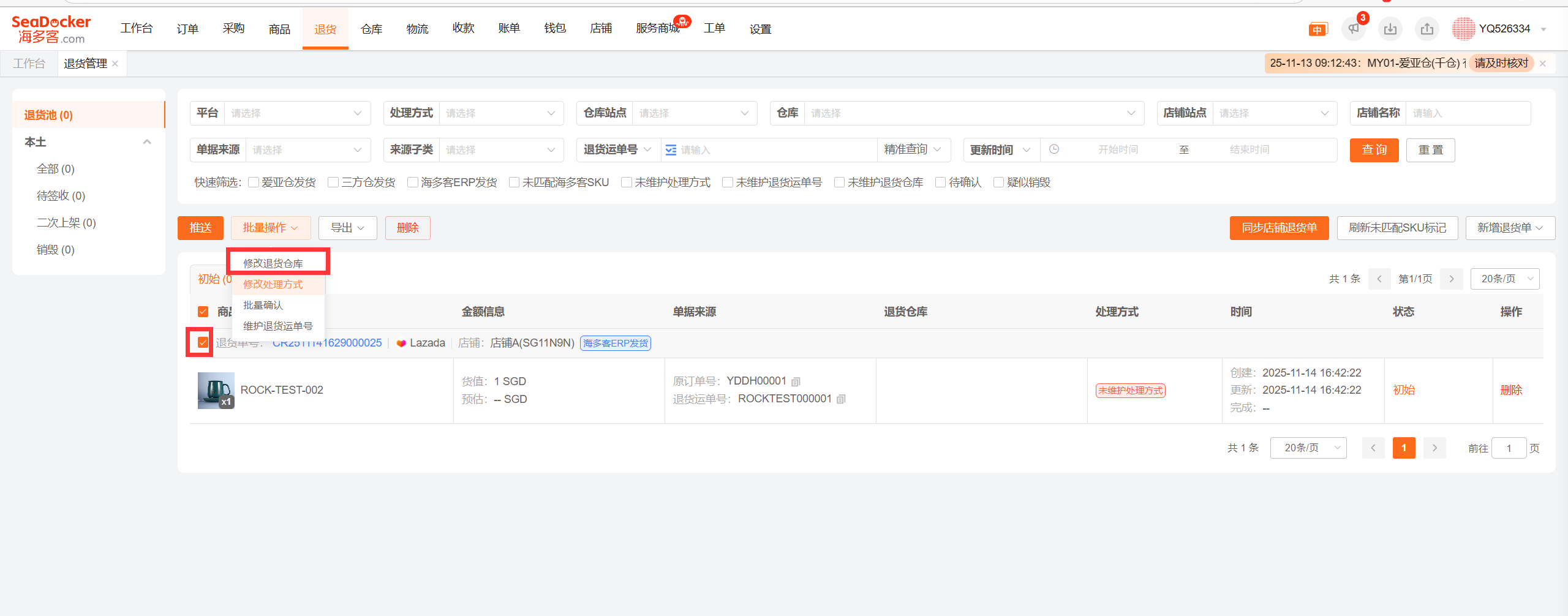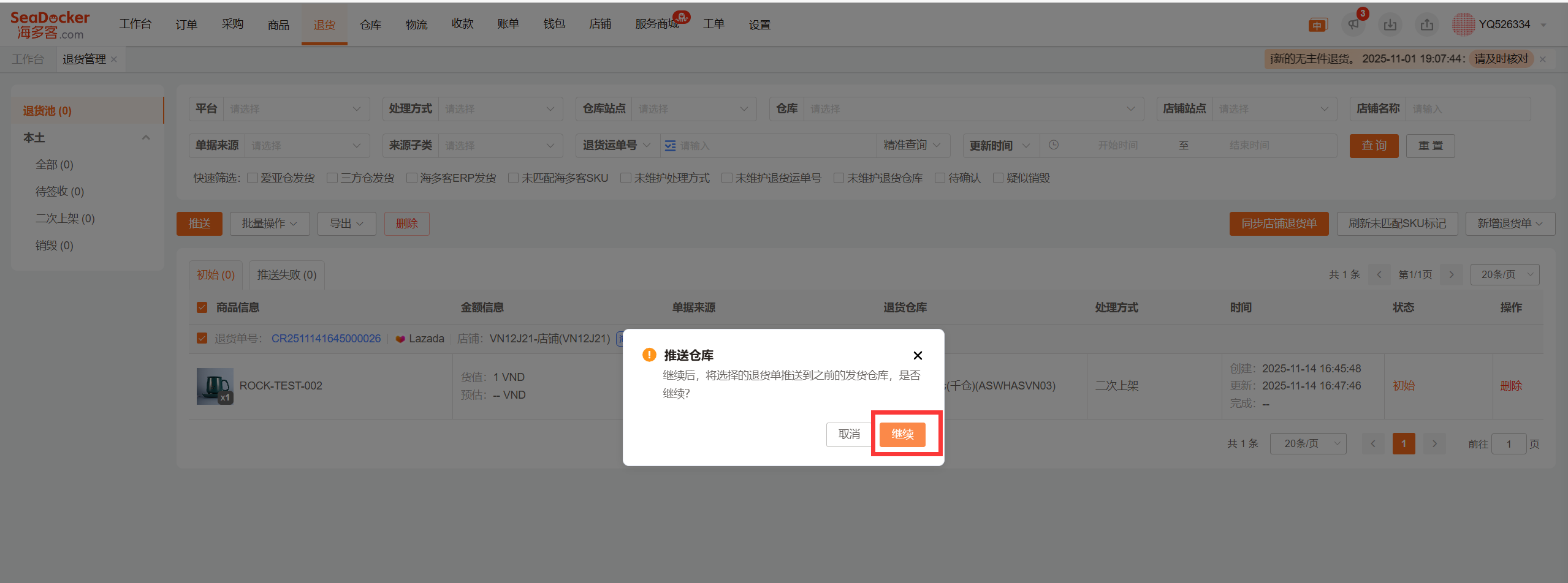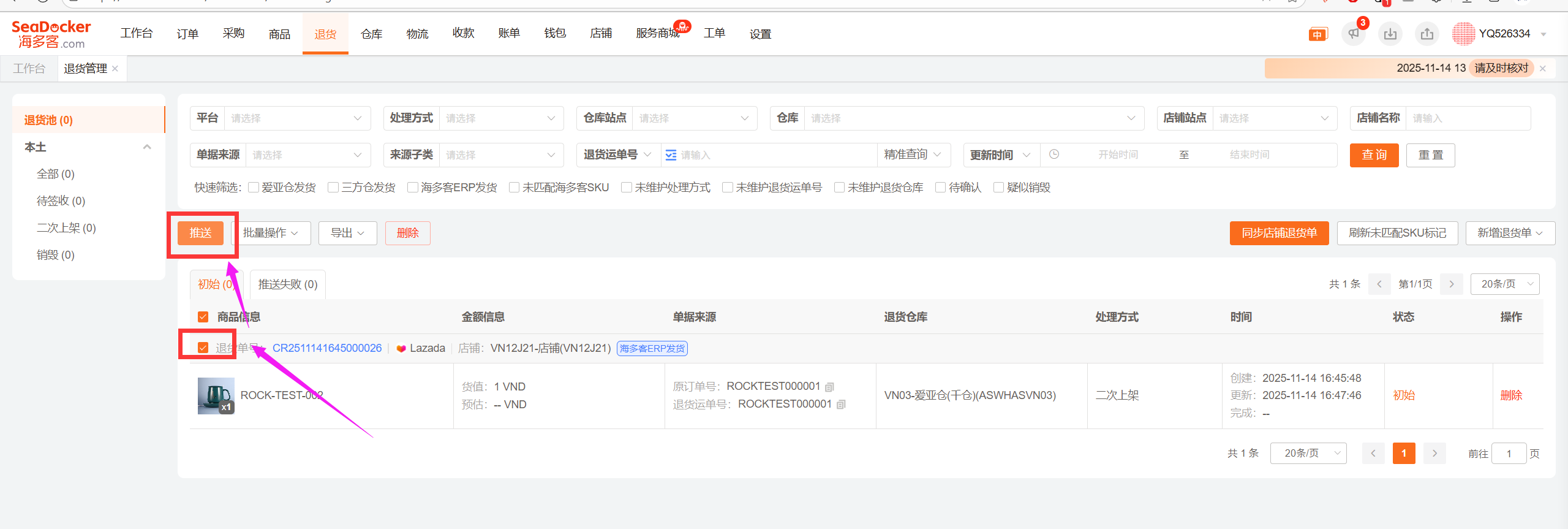 选择退货单-点击推送-订单就会推送对应的退货仓库