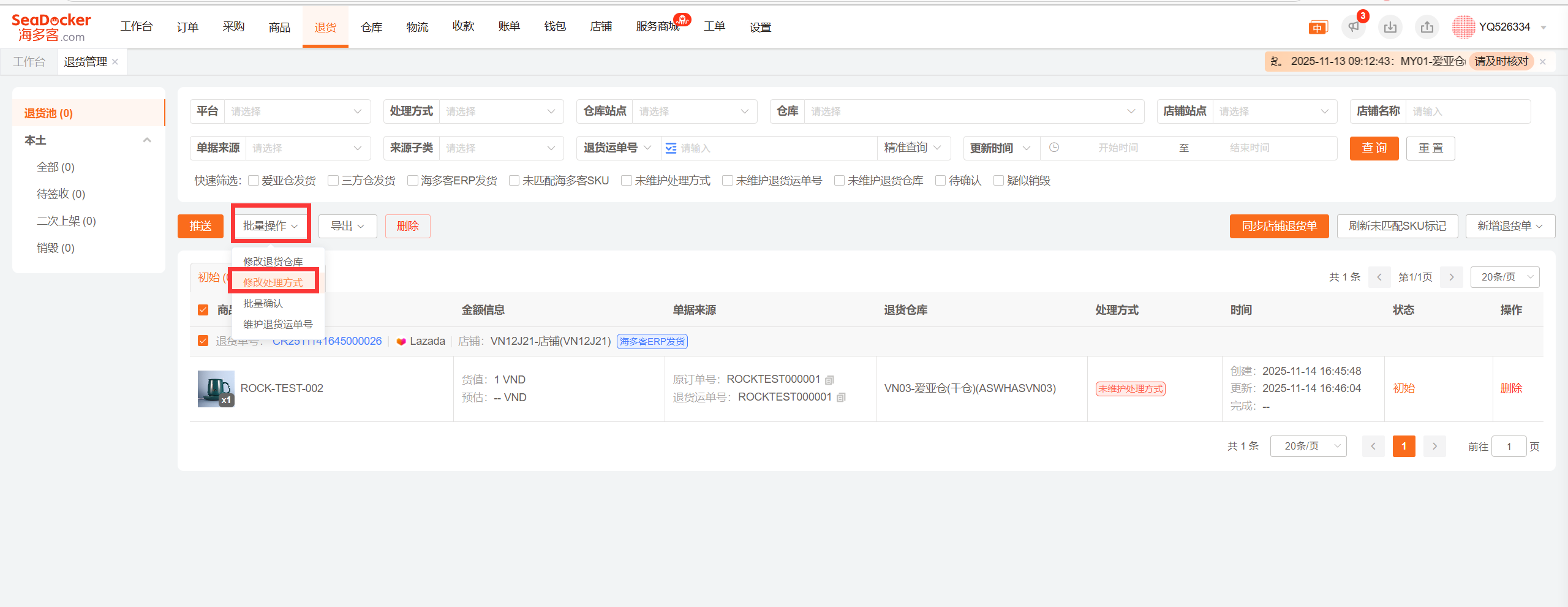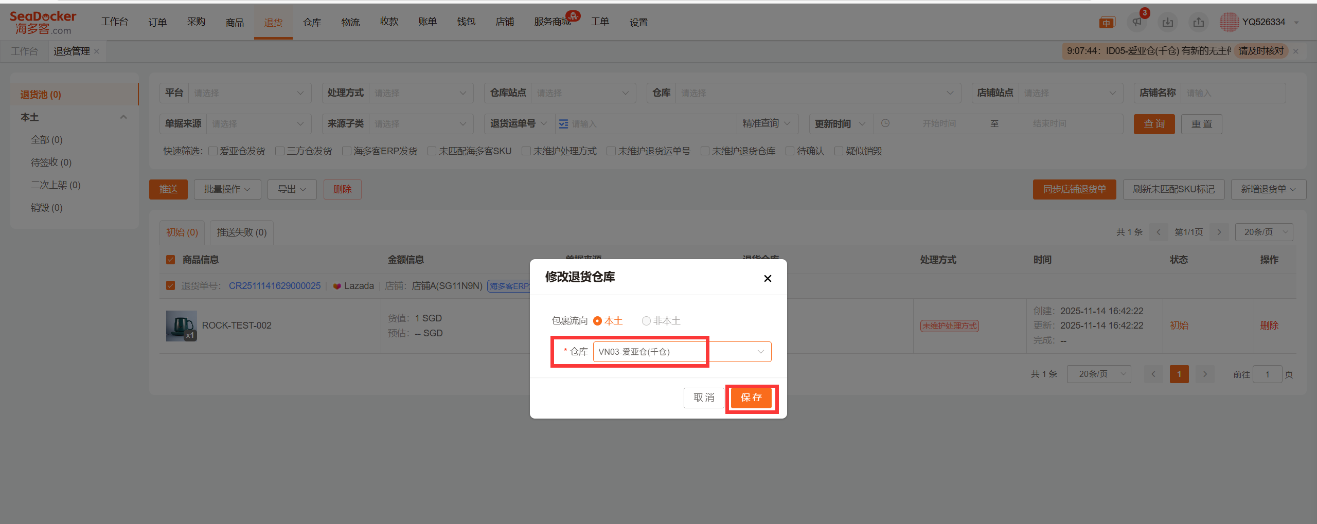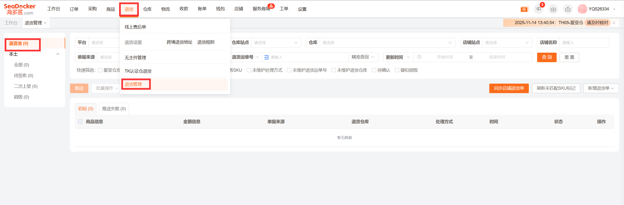 选择退货单-点击推送-订单就会推送对应的退货仓库