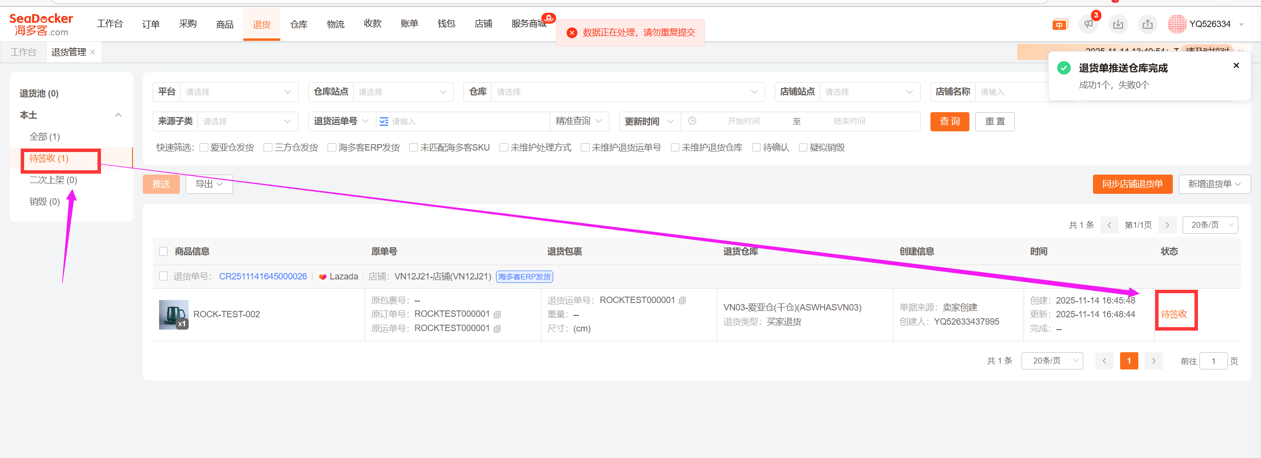退货单如果推送成功-退货单就会在待签收页面(等待仓库签收退货上架就行)