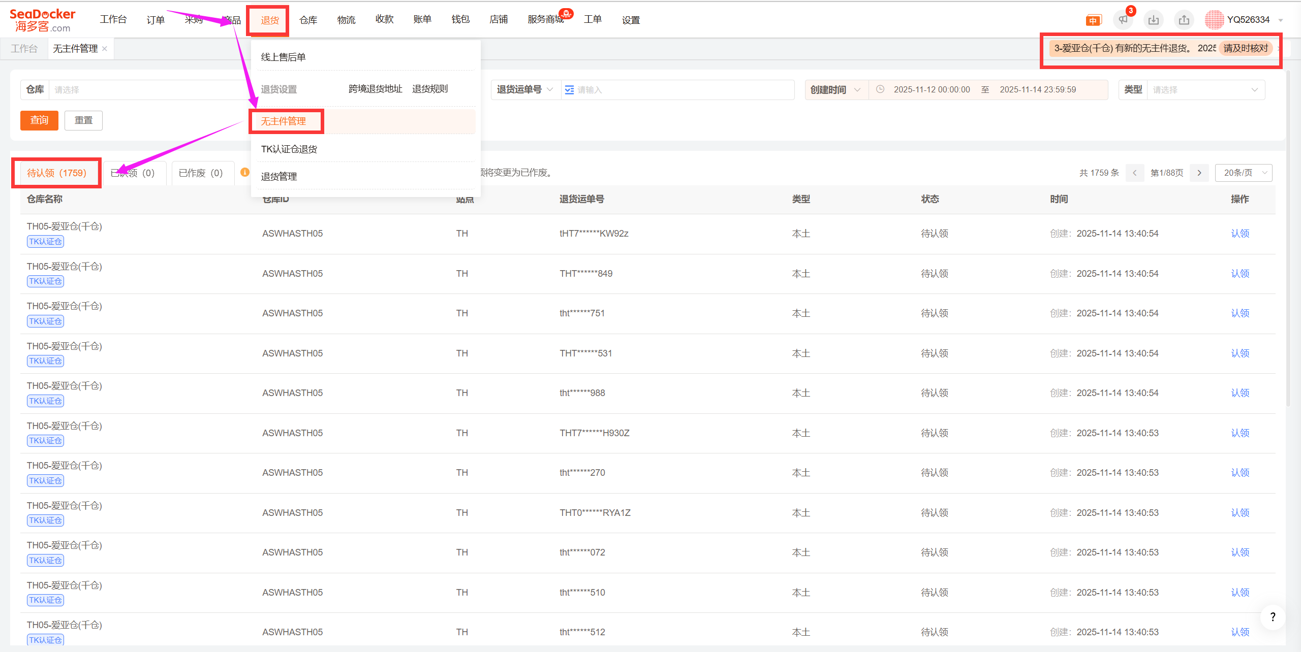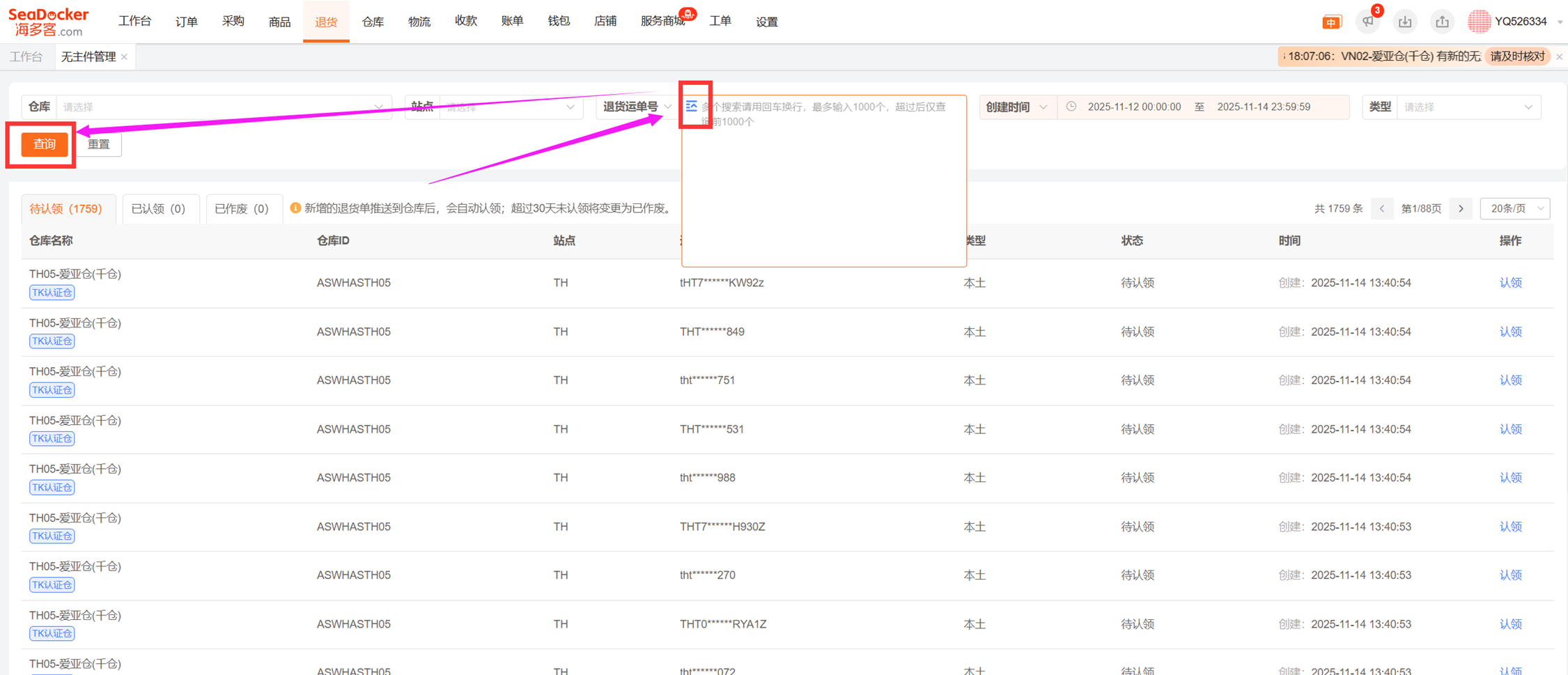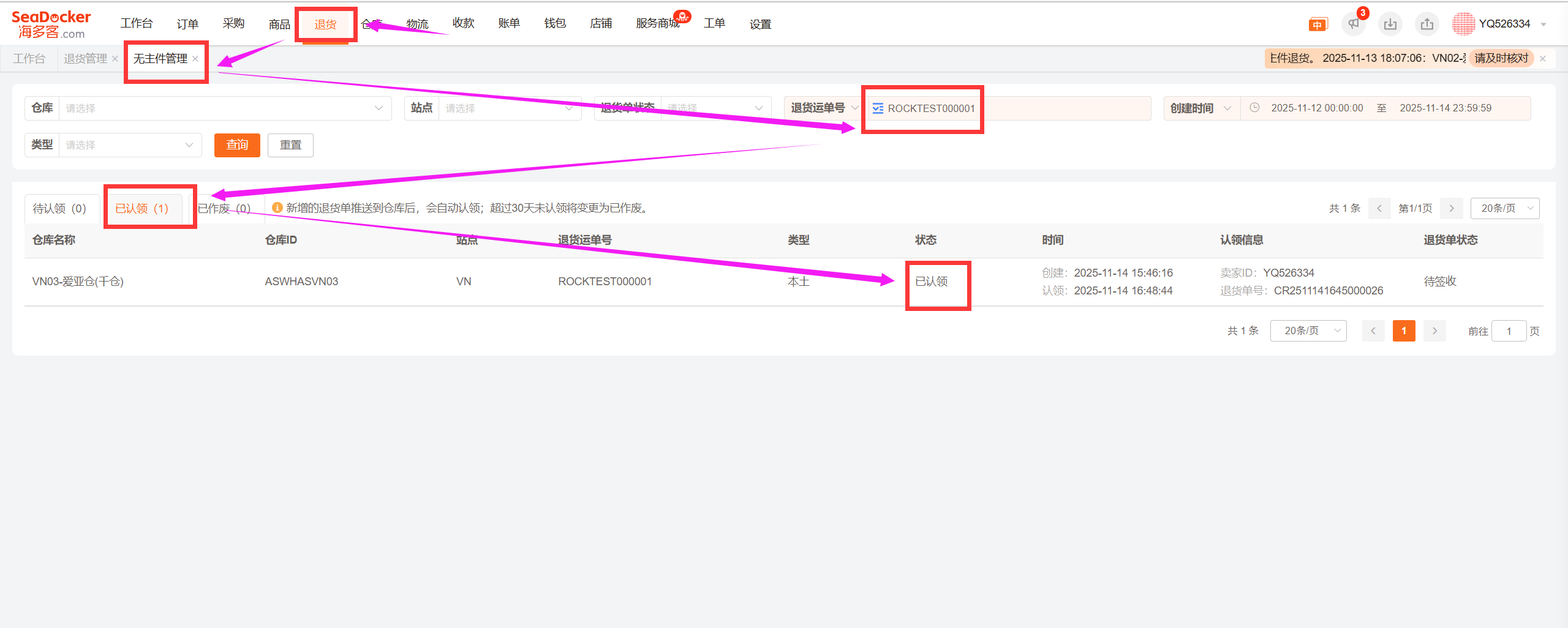 待认领:客户可以在这个页面查询是否有自己的退货(可以认领的退货)