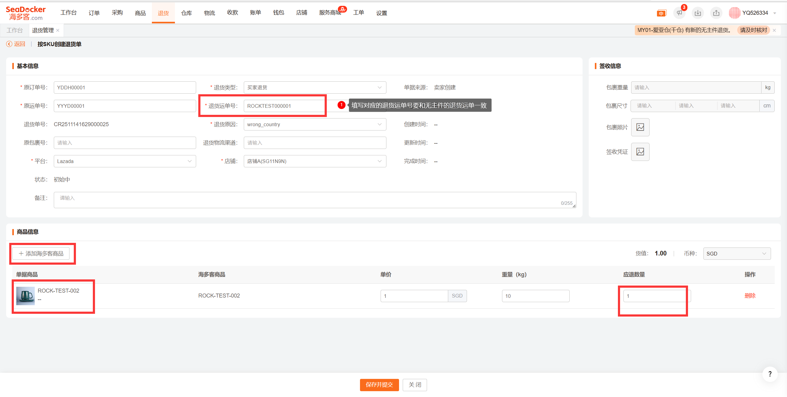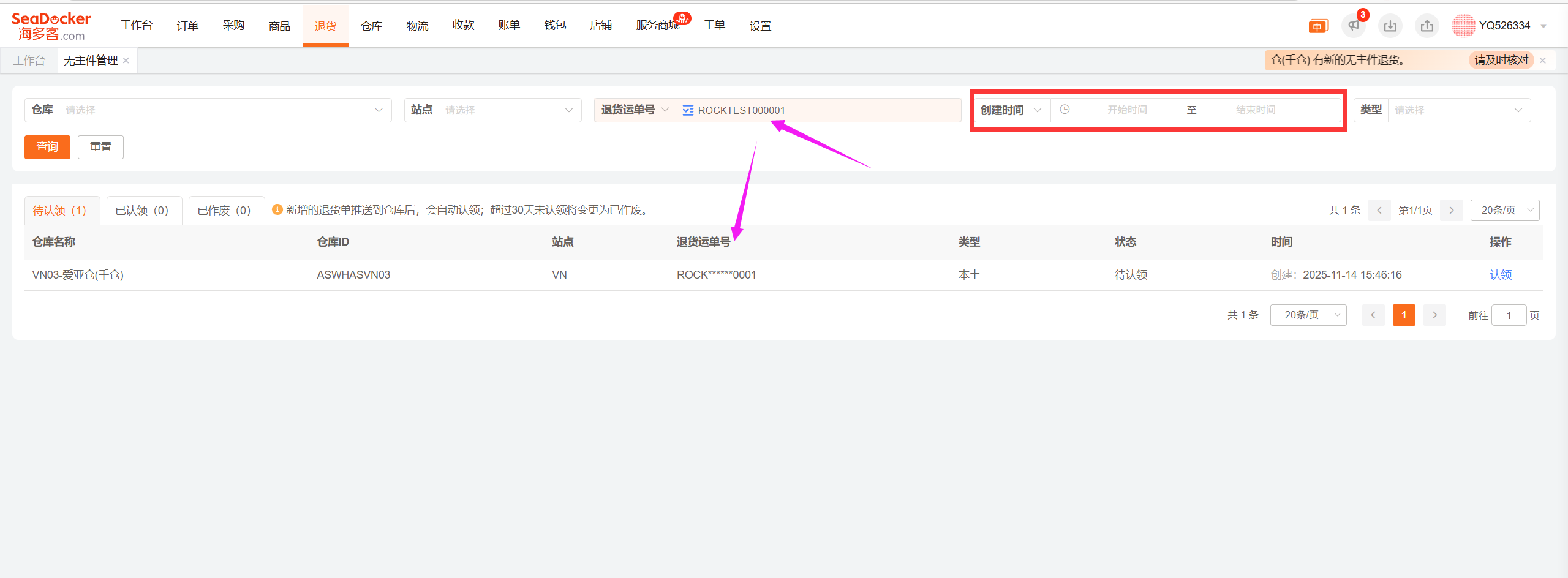 在无主件管理里面查询到自己的退货后,要去退货管理创建对应的退货单下发到对应的退货仓库后才能自动认领退货!