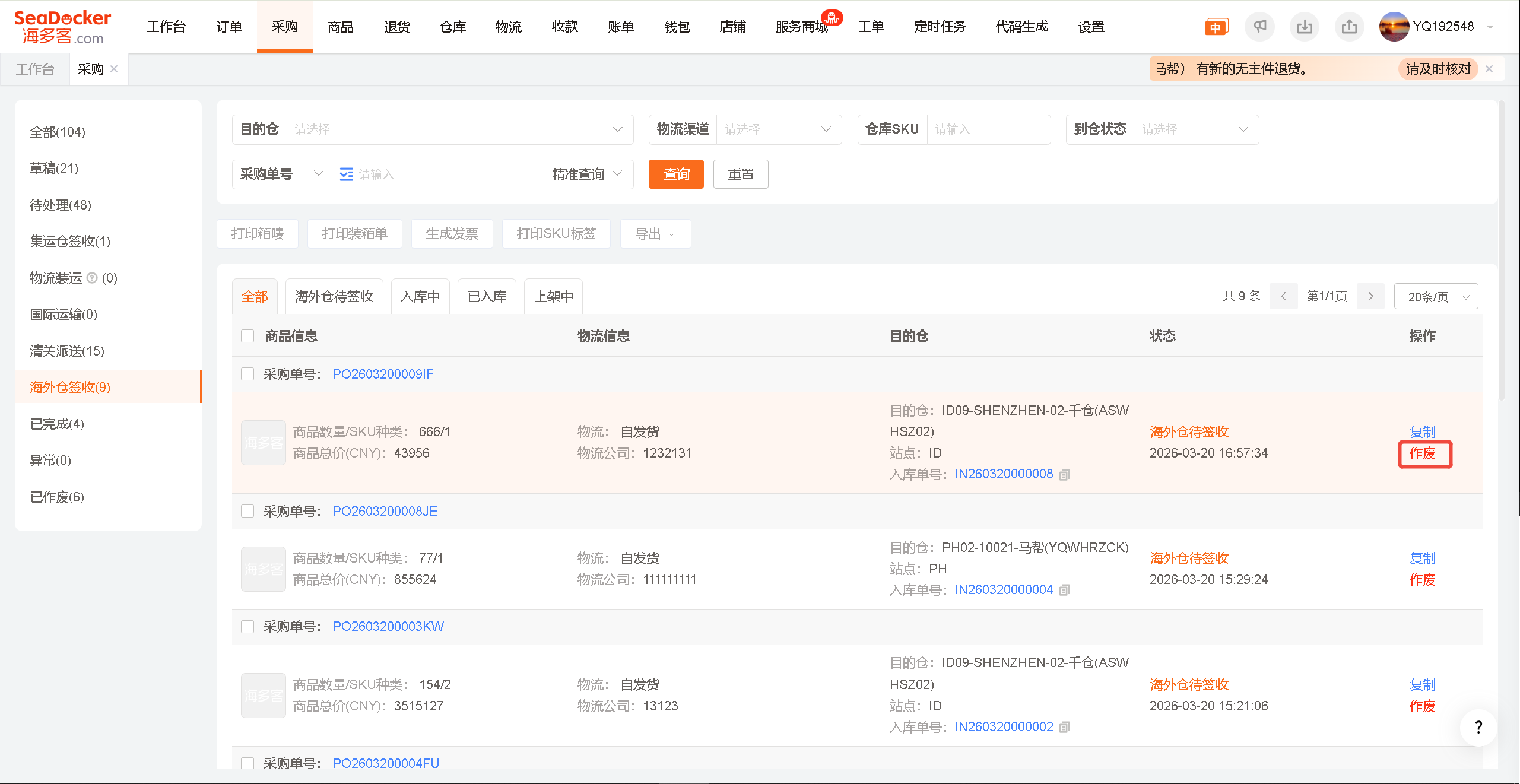1)点击【采购】进入页面,点击【已作废】tab,选择【海外仓待签收】tab。