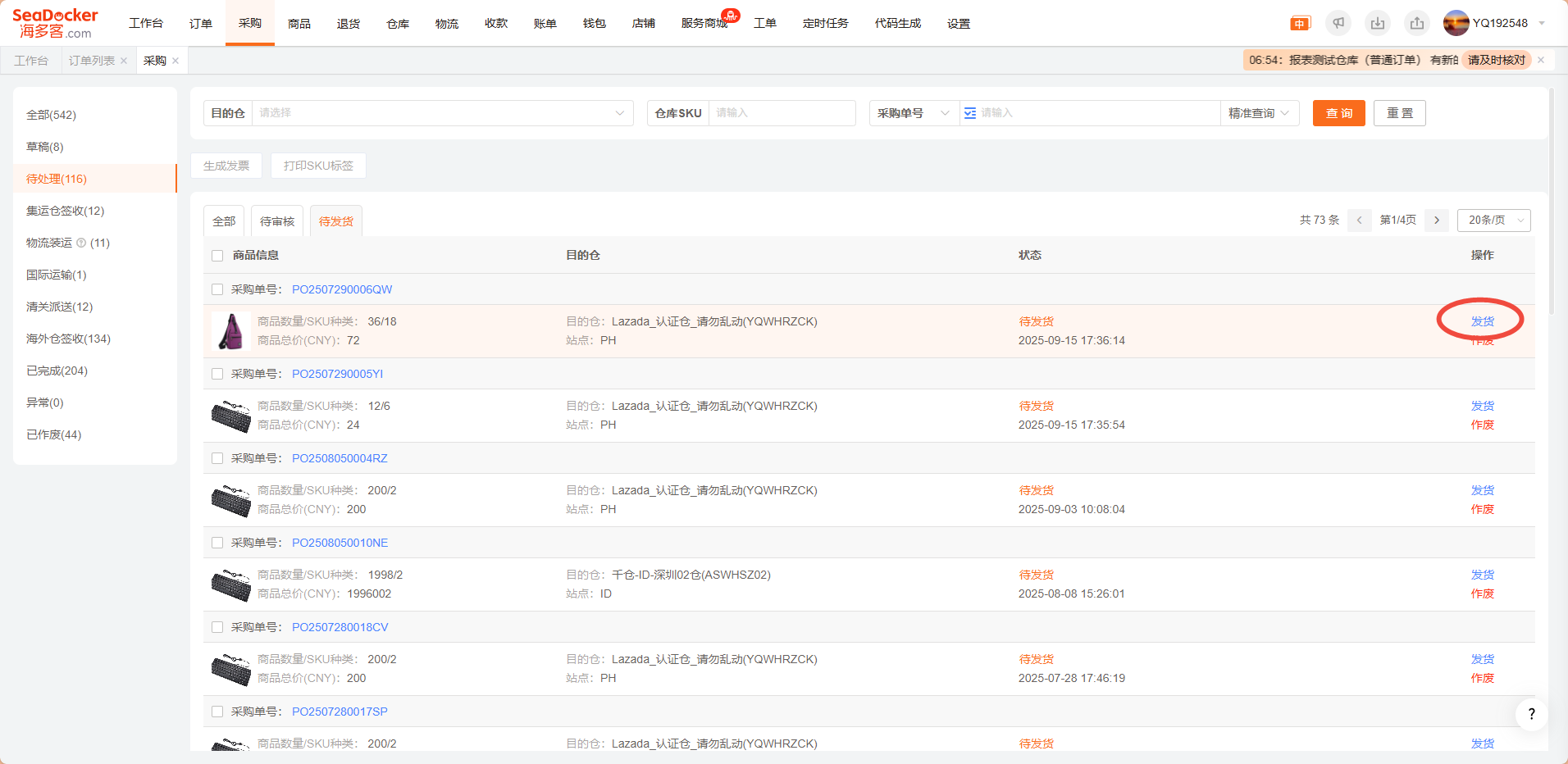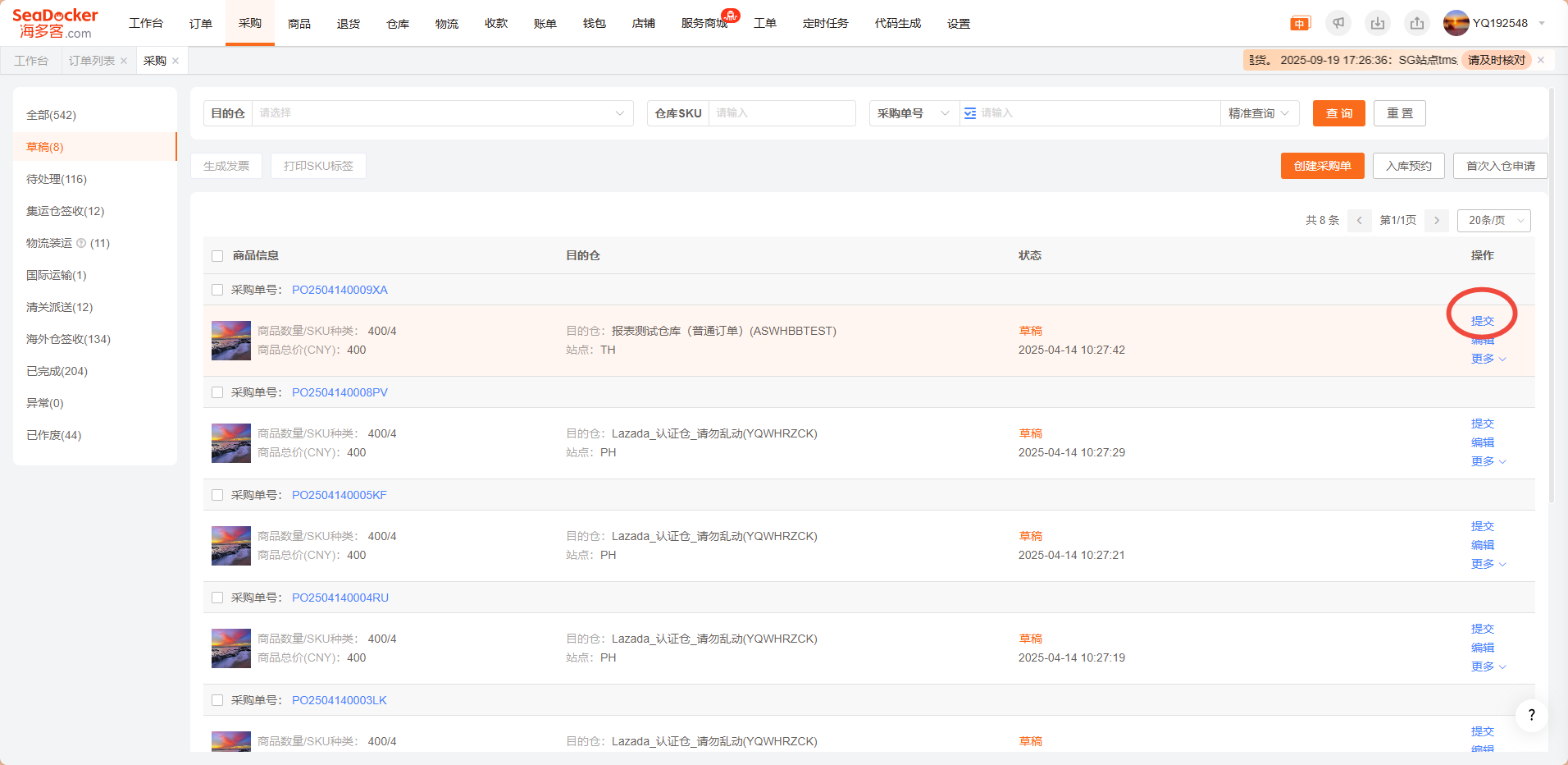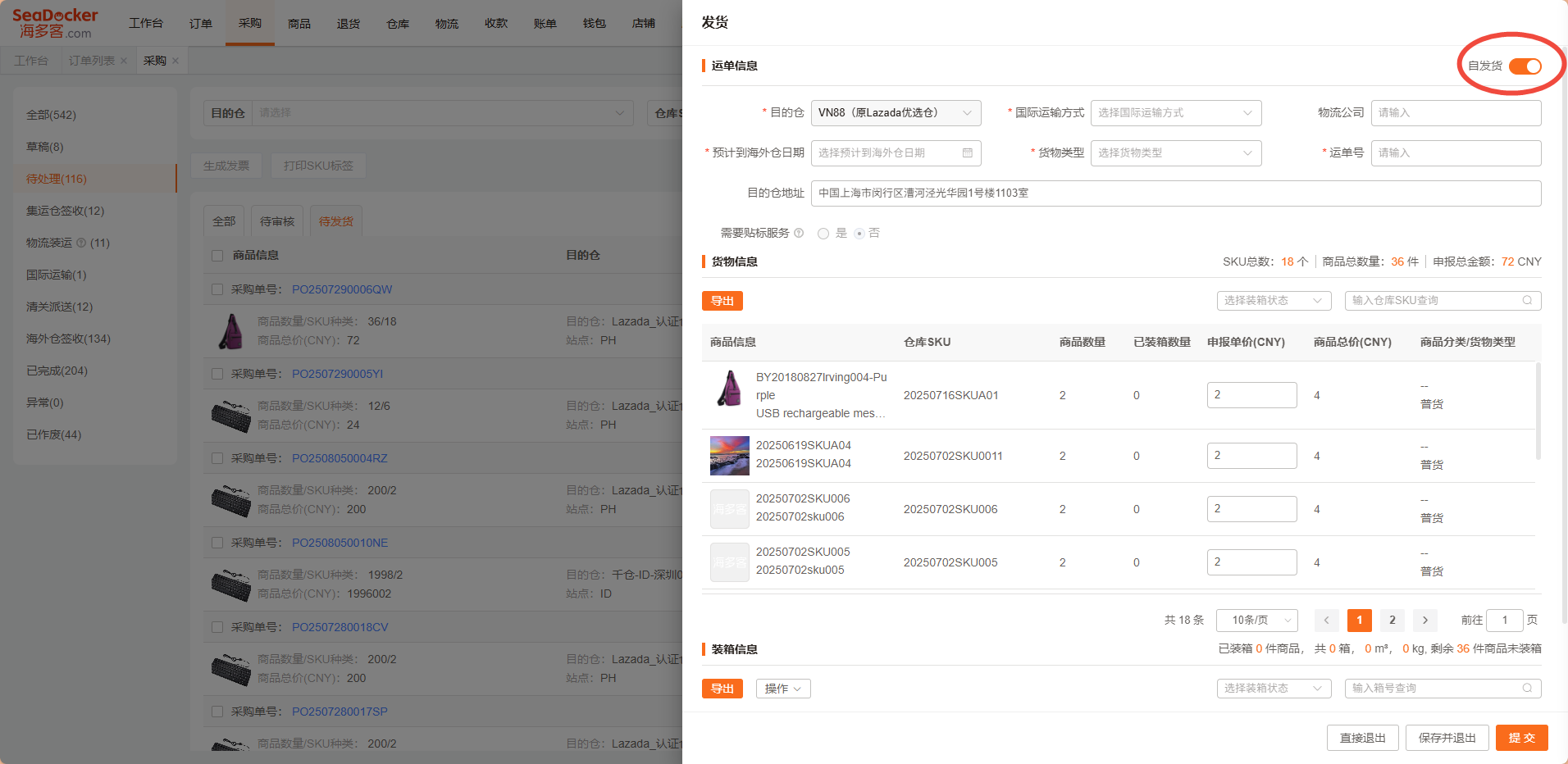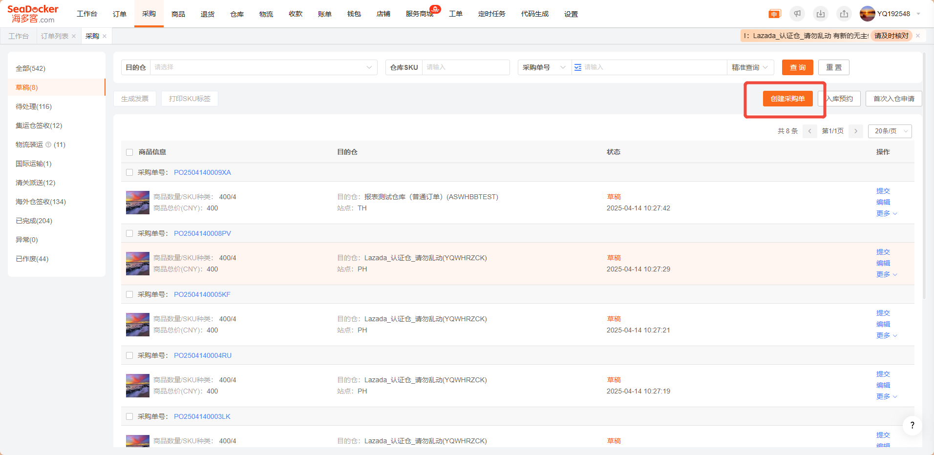 创建采购单之前,请先订阅物流,订阅仓库,维护仓库SKU和SeaDocker SKU的匹配关系,否则无法正常使用采购单功能
