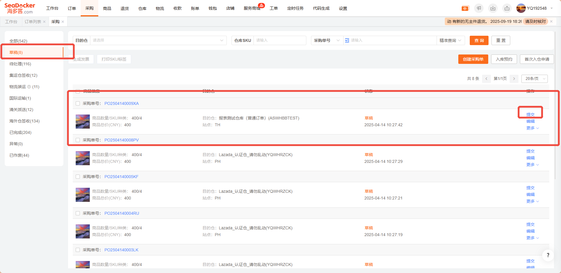 说明:草稿状态可以编辑采购单,提交后无法再进行编辑采购单