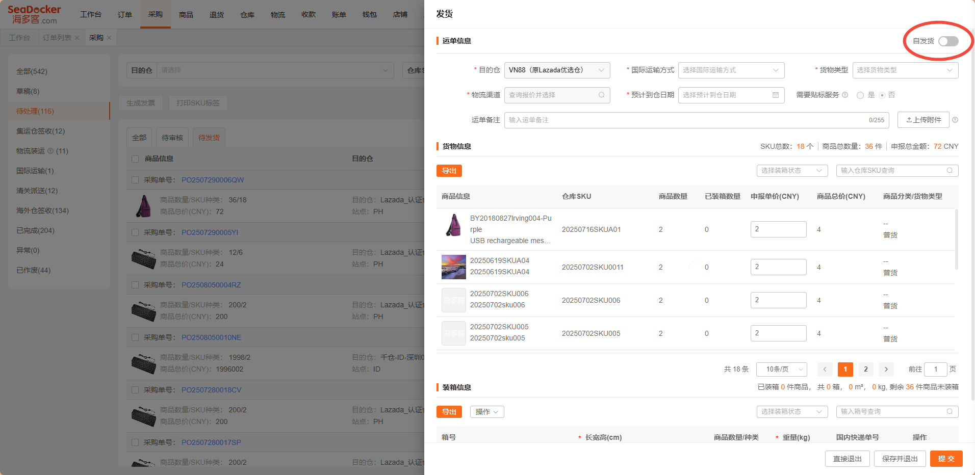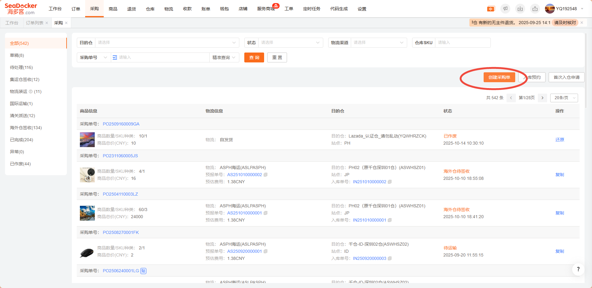 创建采购单之前,请先订阅物流,订阅仓库,维护仓库SKU和海多客SKU的匹配关系,否则无法正常使用采购单功能