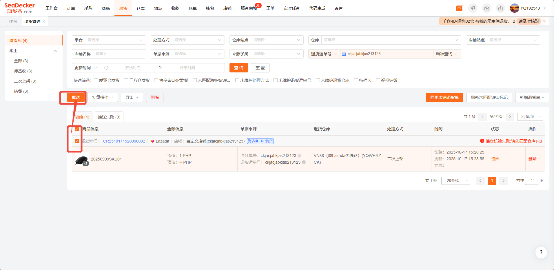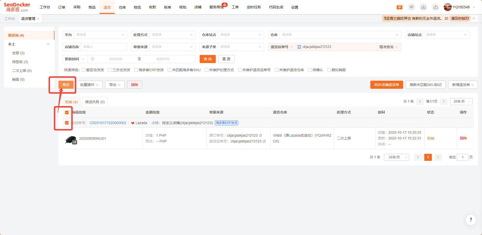 操作步骤11:【勾选】要处理的退货单,点击【推送】