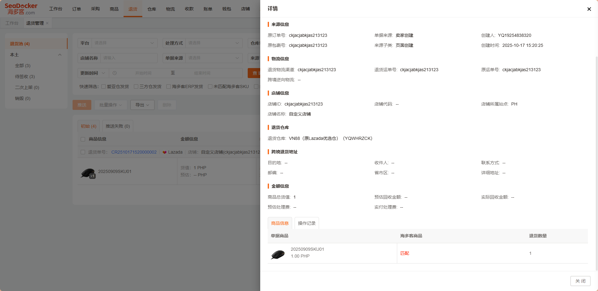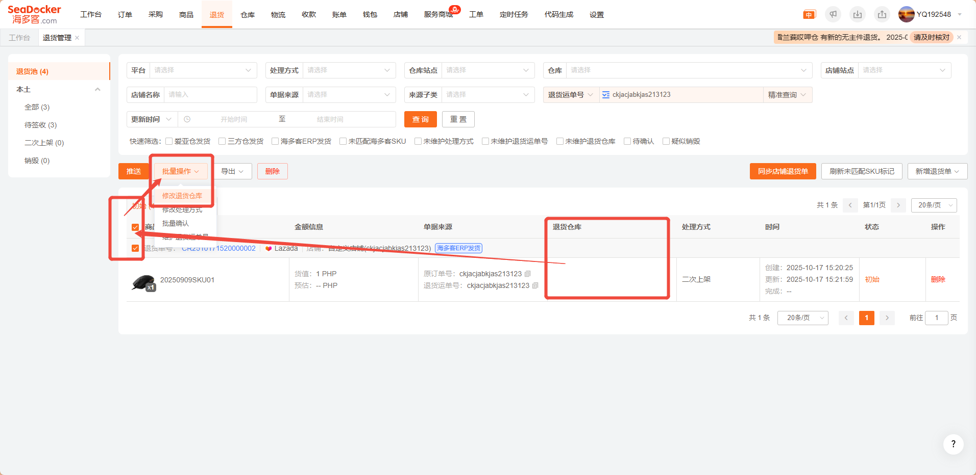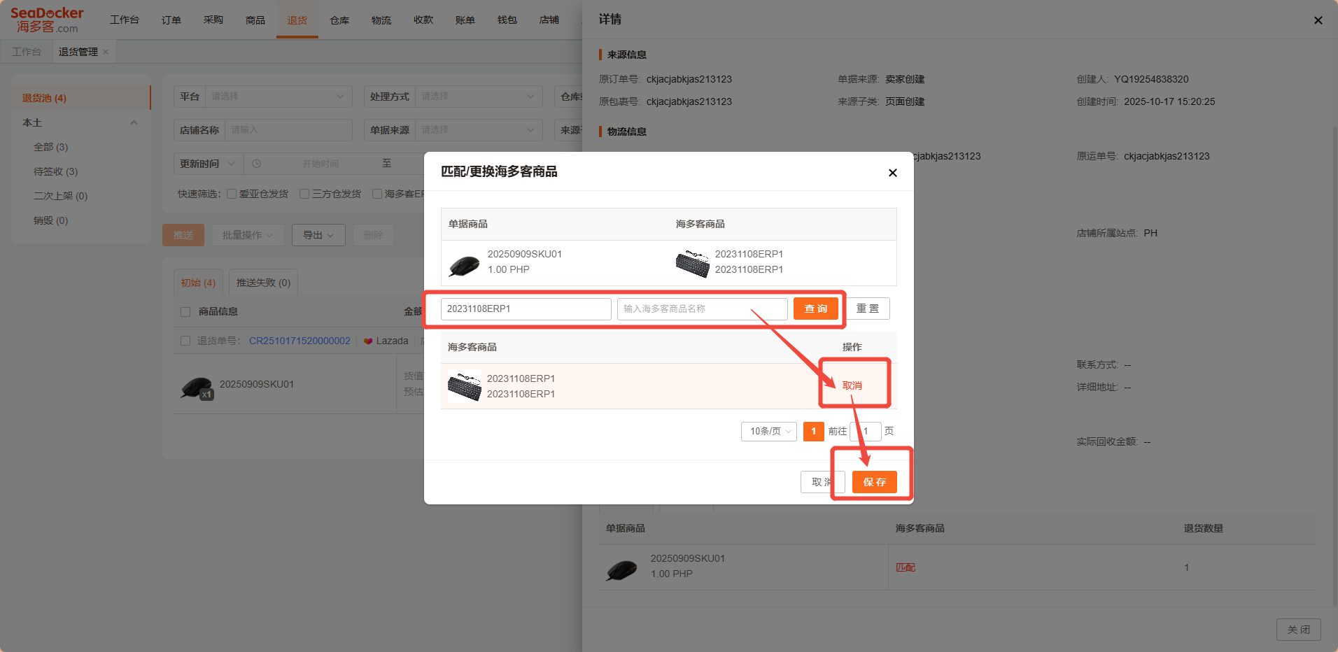 12、选择【退货仓库】下发生退货的【仓库sku】已匹配上的【海多客sku】