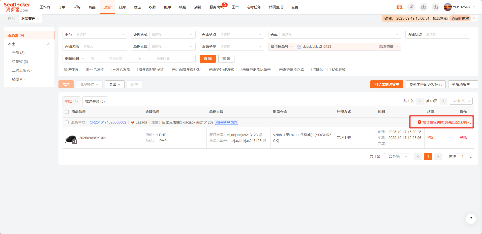 2,退货单内的仓库sku在仓库系统中不存在,推送会失败