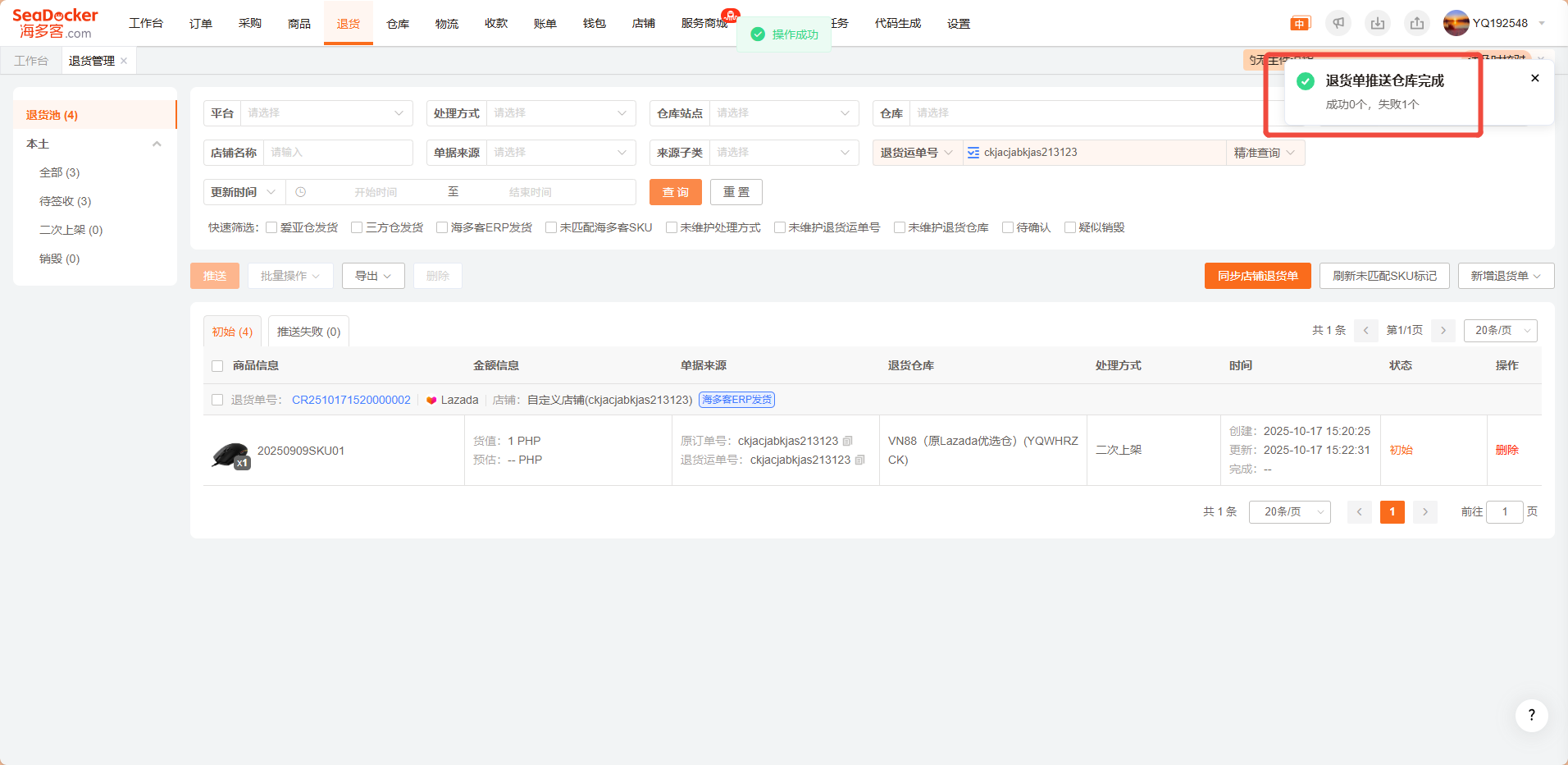 9、如果【推送失败】,请刷新页面,再次筛选该退货单