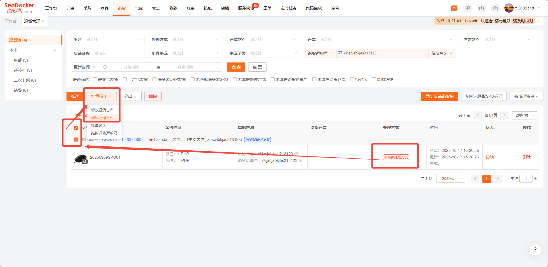 操作步骤9:【勾选】要处理的退货单,点击【批量操作】-【批量确认】