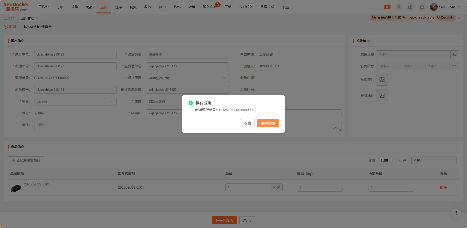 我这里教程只创建1个退货单,点击【返回】。点击后,到以下截图页面