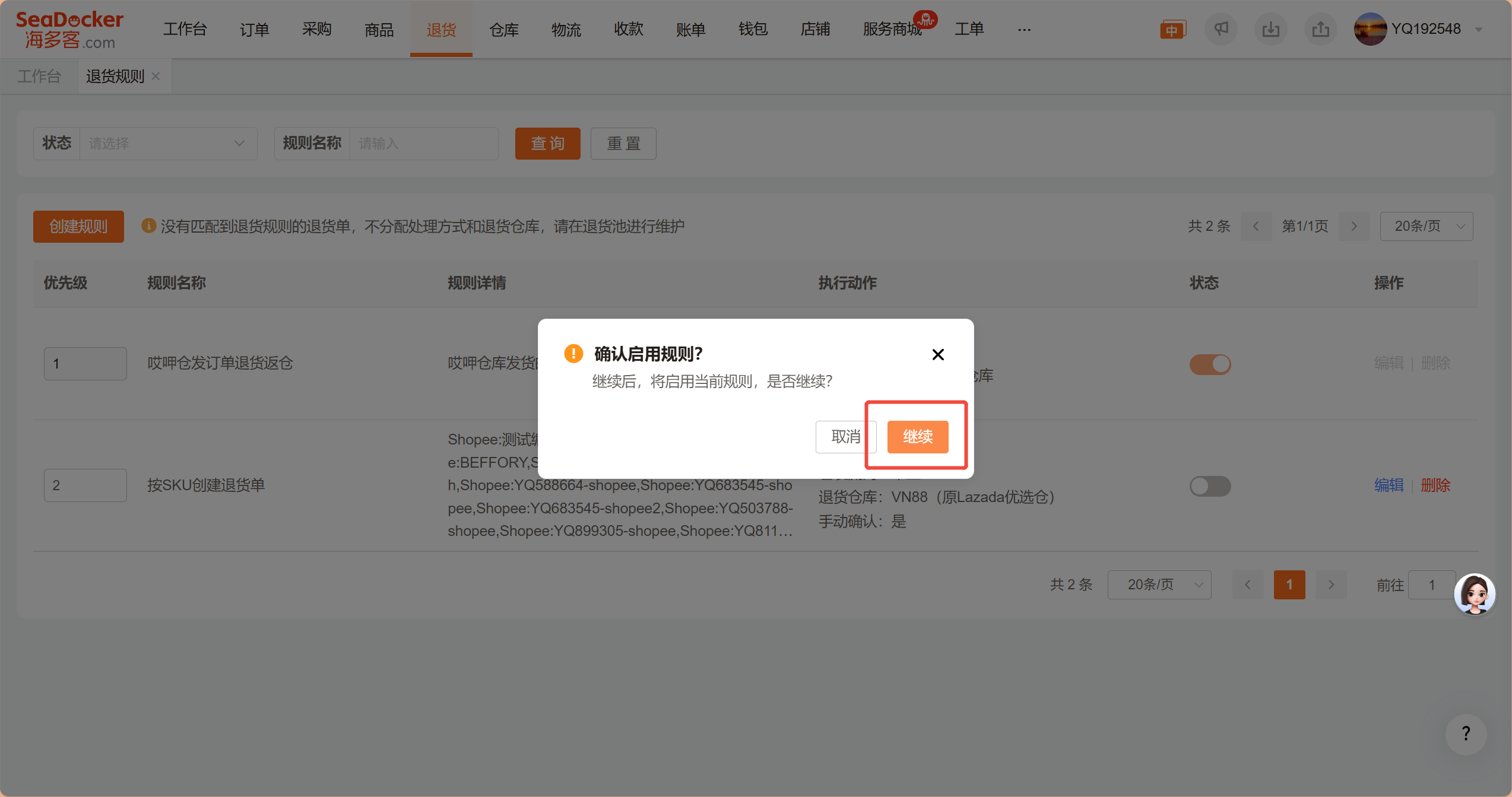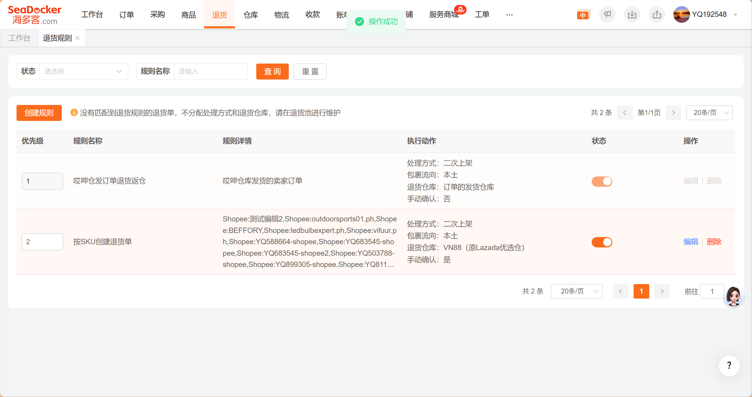 说明:创建的订单需要【手动确认】,则需要手动操作【批量确认】才能推仓成功。如果不需要手动确认,请到【退货规则】设置规则。