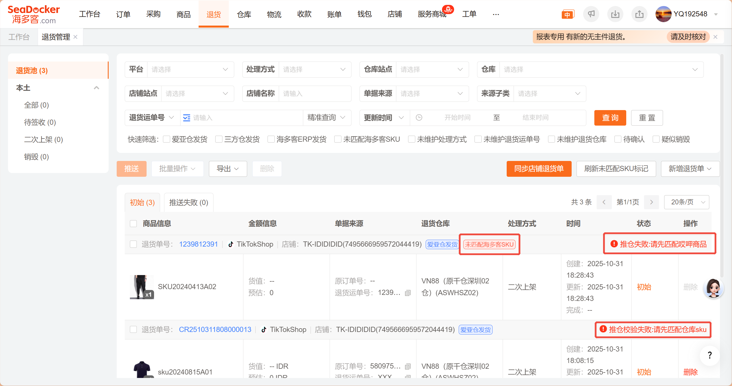 答:TK认证仓退货的数据,自动认领成功后系统会自动按照【仓库】+【逆向运单号】+【商户ID】+【SKU】创建退货单并自动进行推仓。需要客户维护【店铺SKU】和【海多客SKU】的匹配关系,在【商品-商品匹配】页面操作。还需要维护【仓库】下【仓库SKU】和【海多客SKU】的匹配关系,在【商品-库存管理】页面操作。