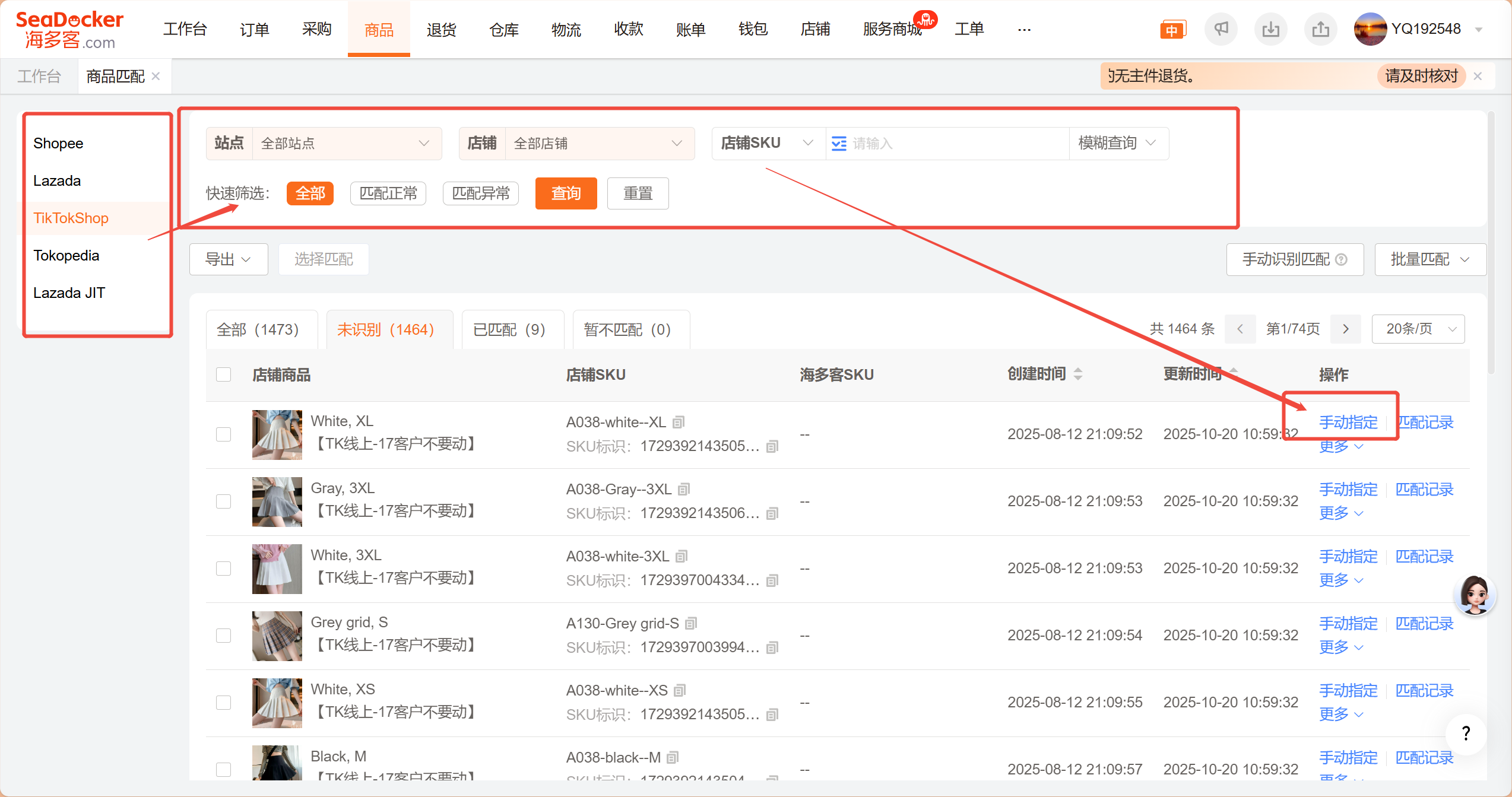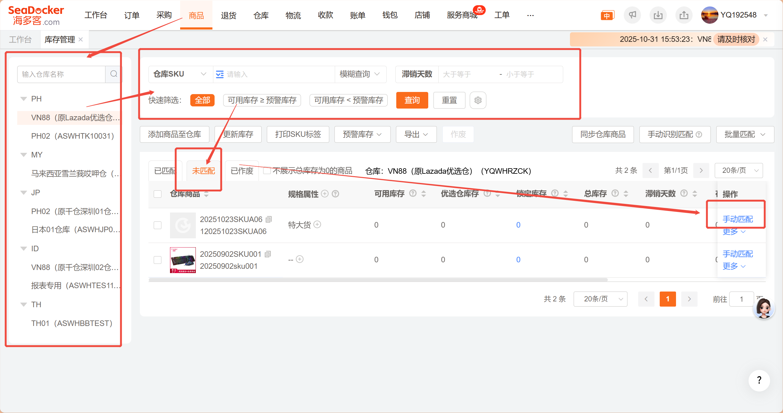操作步骤:点击【商品-库存管理】页面,选择【仓库】,搜索要处理的【仓库SKU】,点击【手动匹配】进行匹配。如下截图操作。到【已匹配】tab支持更换【海多客SKU】