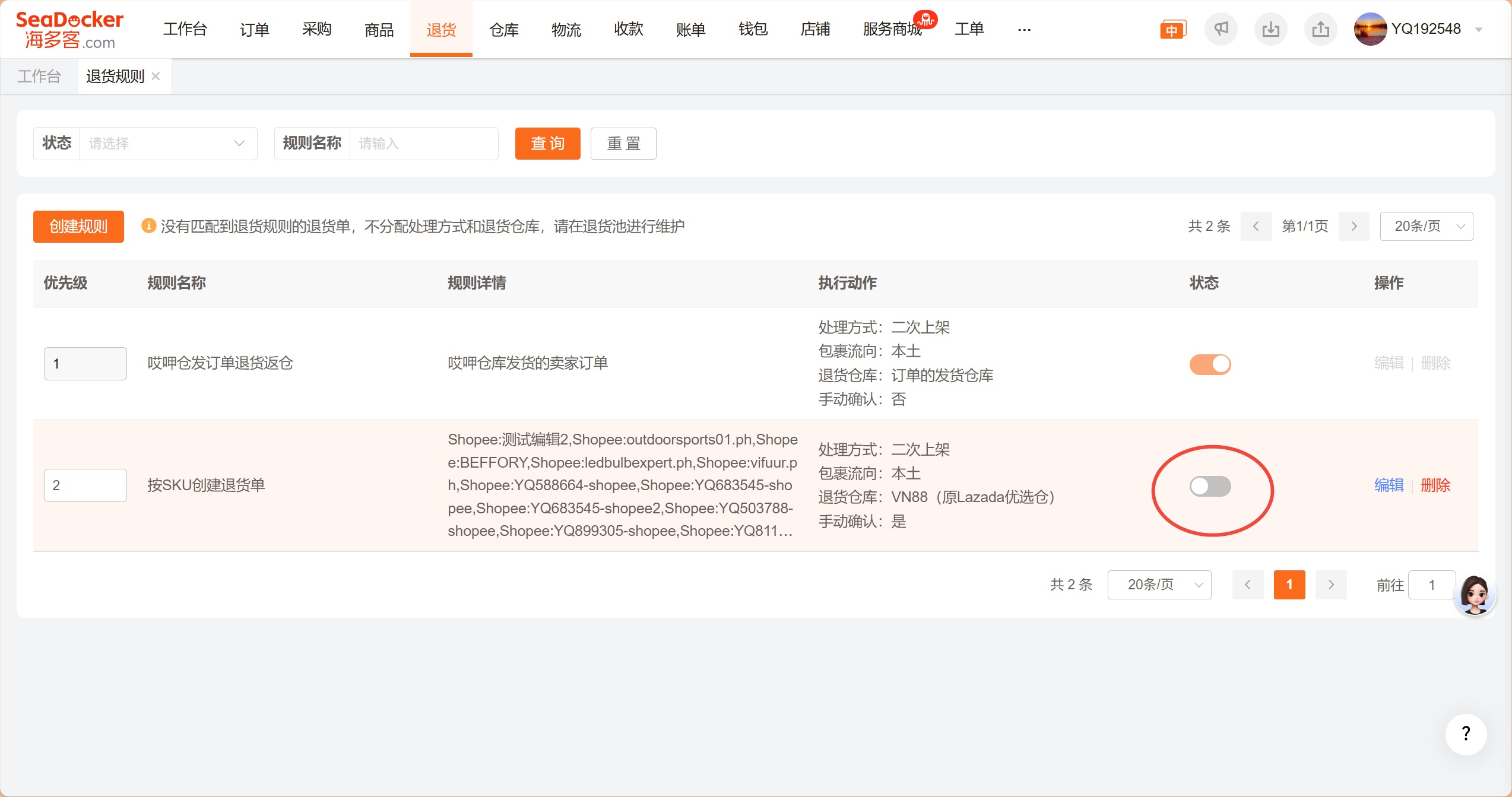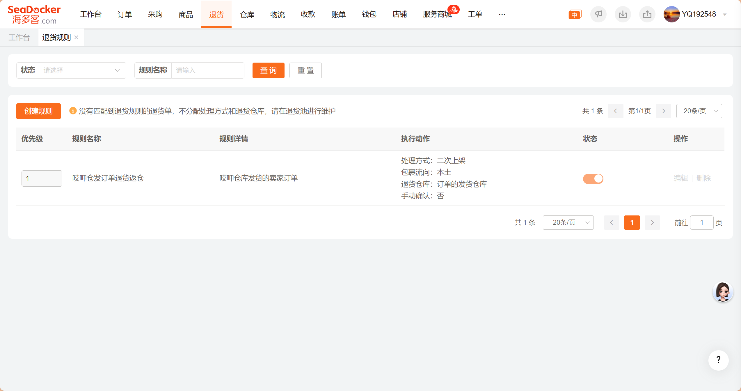 退货规则:系统默认一个规则,不能关闭,不能修改,不能删除