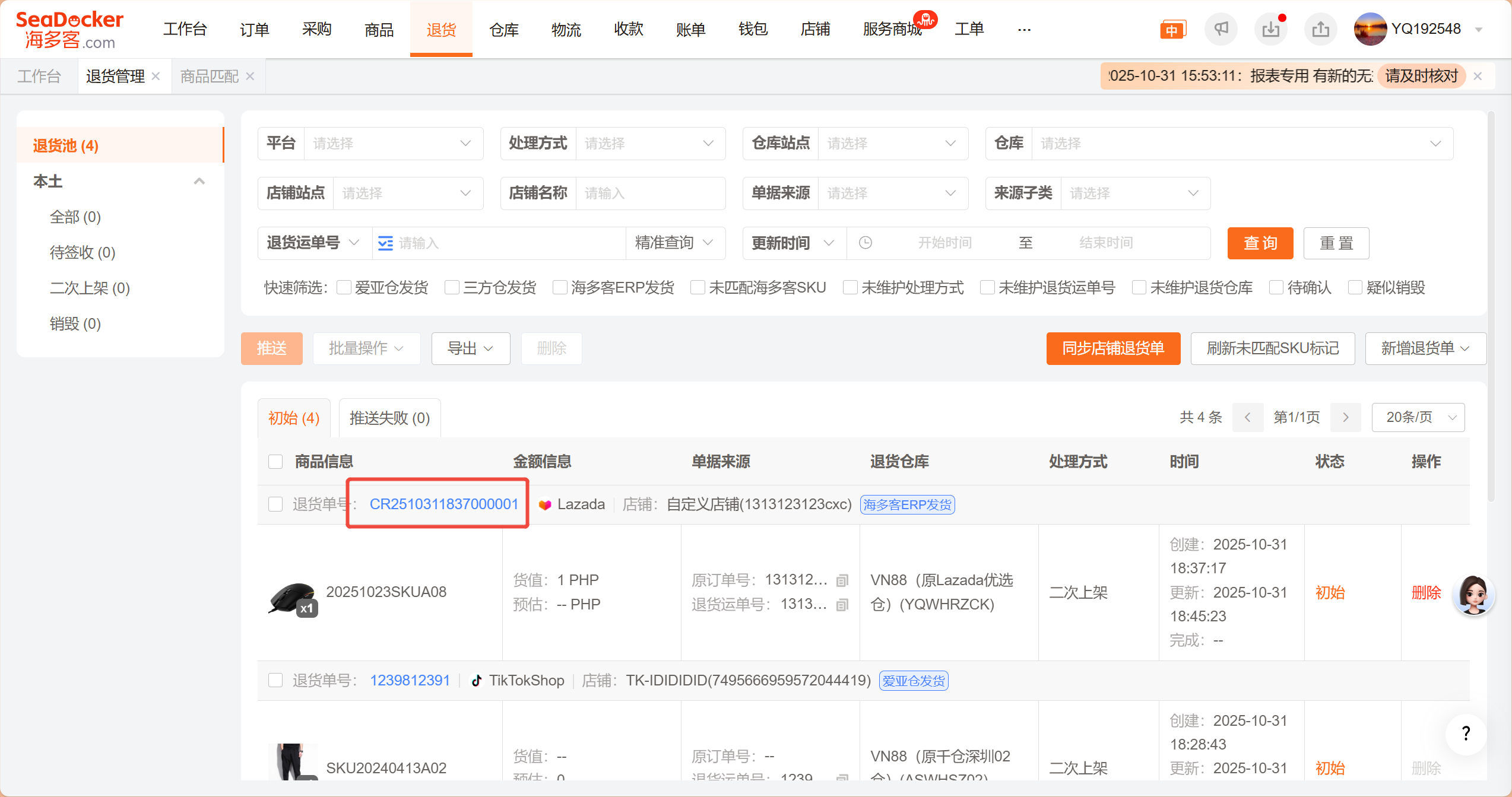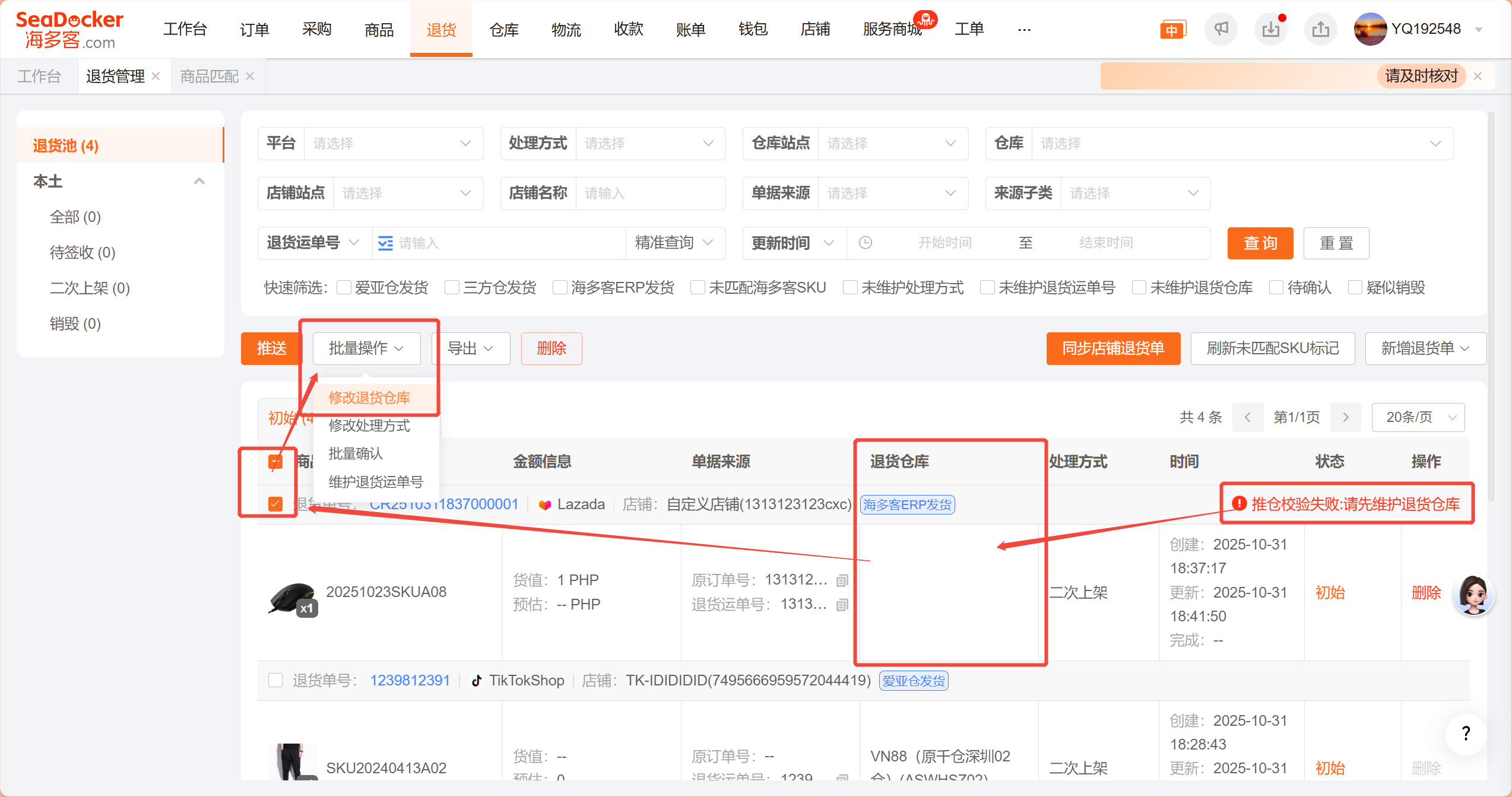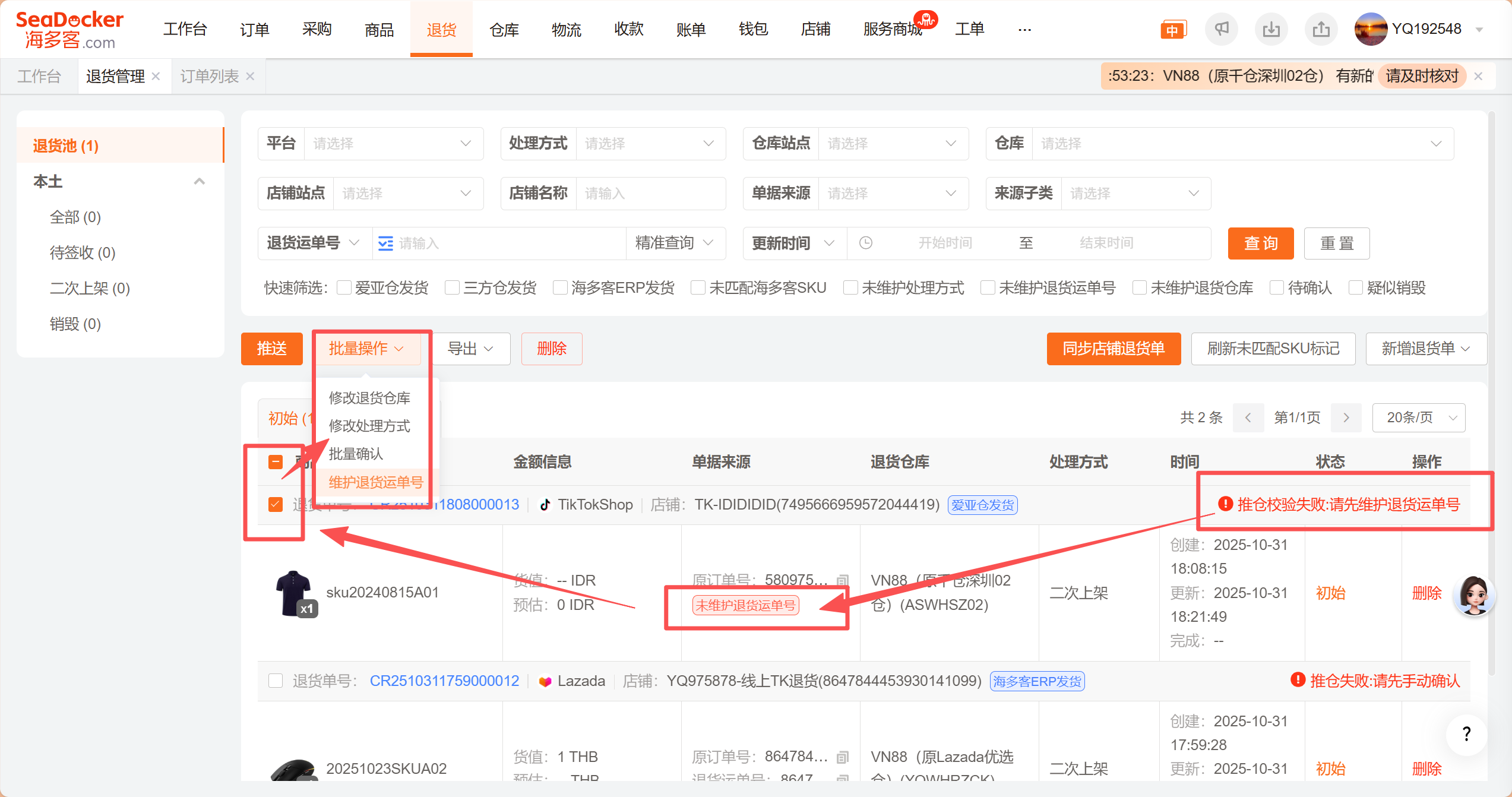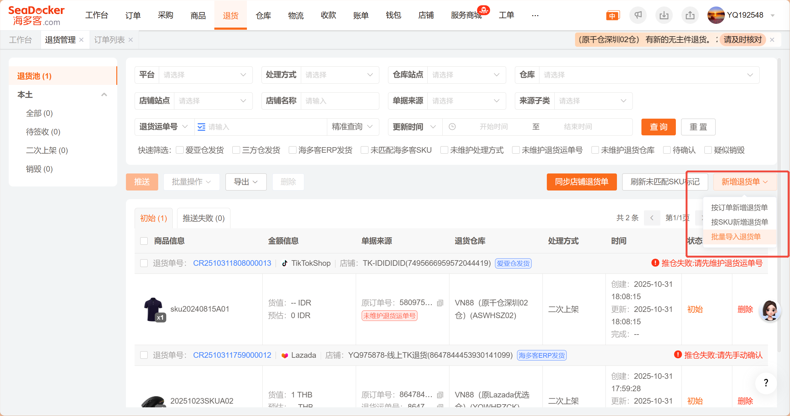 说明:推仓失败的退货单/未推仓的退货单,都在此页面展示。该页面支持【同步店铺退货单】【新增退货单】【刷新未匹配SKU标记】【维护处理方式】【维护退货运单号】【修改退货仓库】【批量确认】【批量推仓】【更换退货商品】【删除退货单】