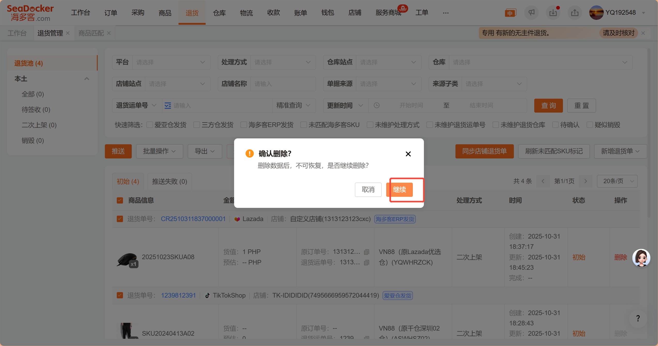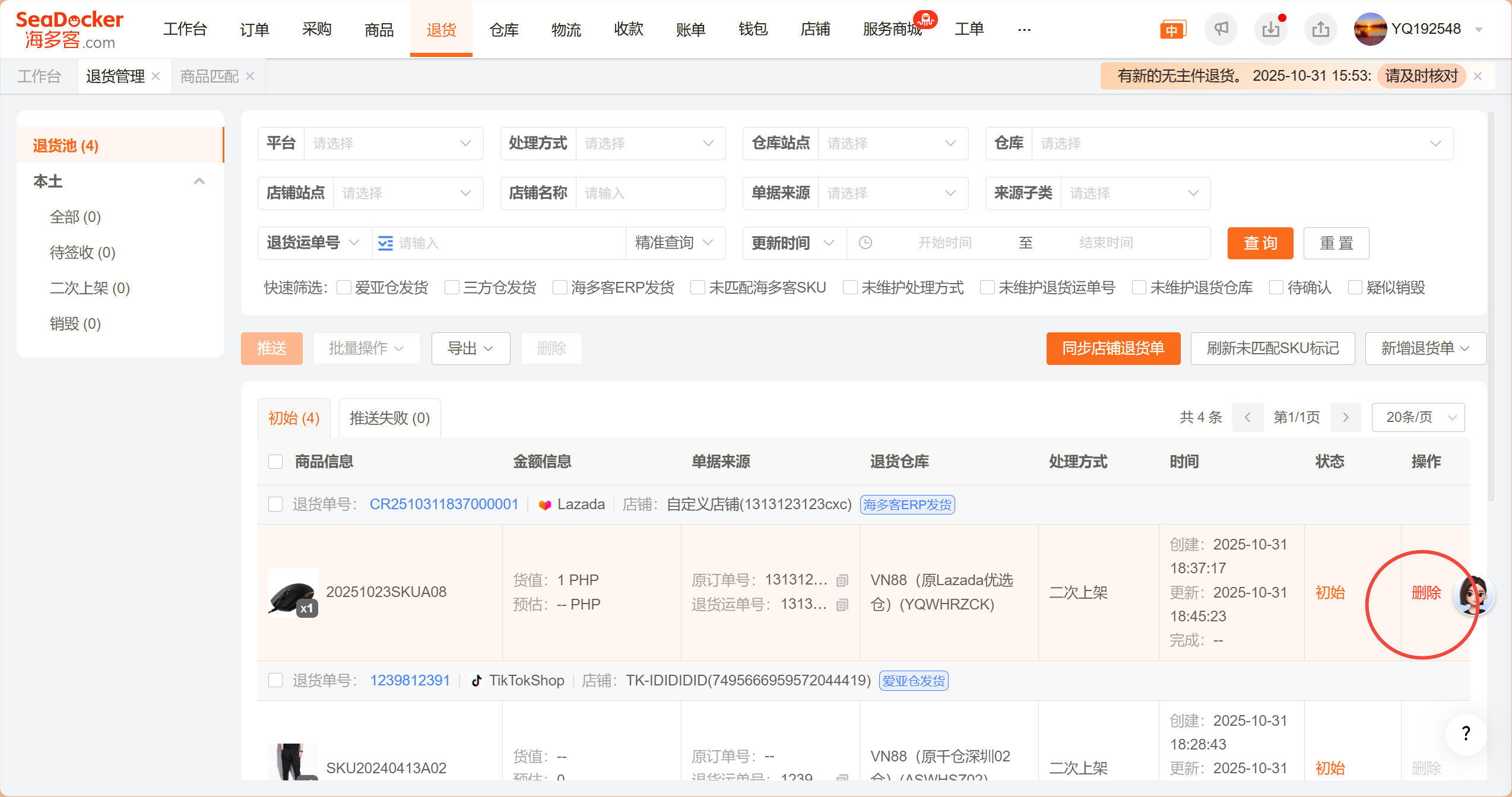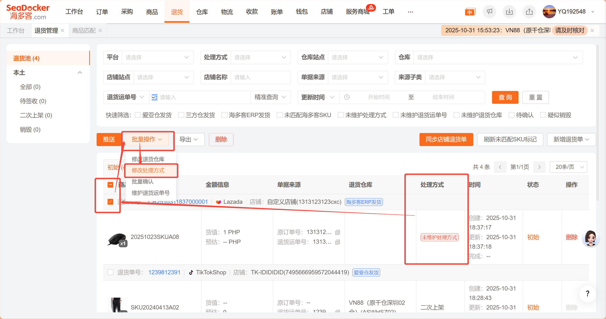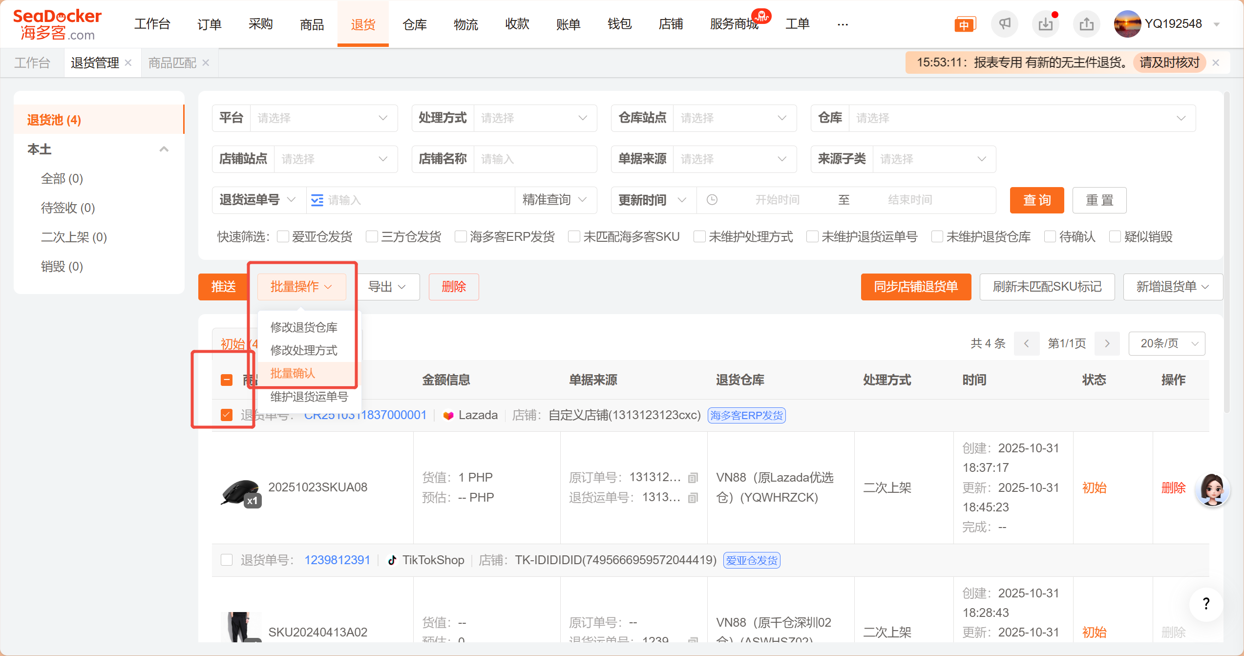 说明:推仓失败的退货单/未推仓的退货单,都在此页面展示。该页面支持【同步店铺退货单】【新增退货单】【刷新未匹配SKU标记】【维护处理方式】【维护退货运单号】【修改退货仓库】【批量确认】【批量推仓】【更换退货商品】【删除退货单】