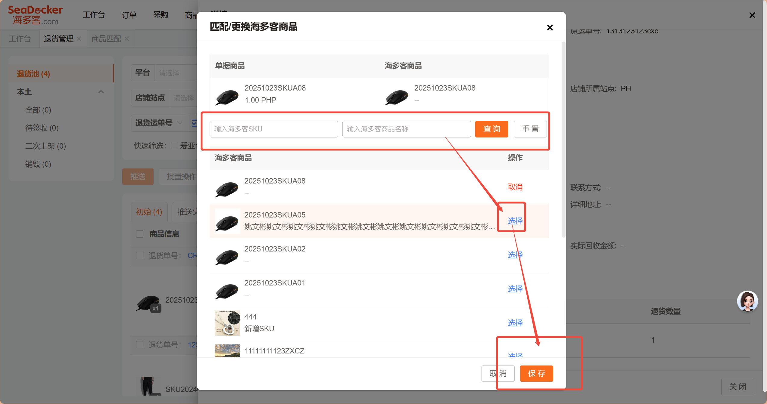 操作步骤:点击【退货单号】进行退货单详情。下拉找到【更换】并点击,找到要更换的【海多客SKU】,点击【选择】点击【保存】进行提交。