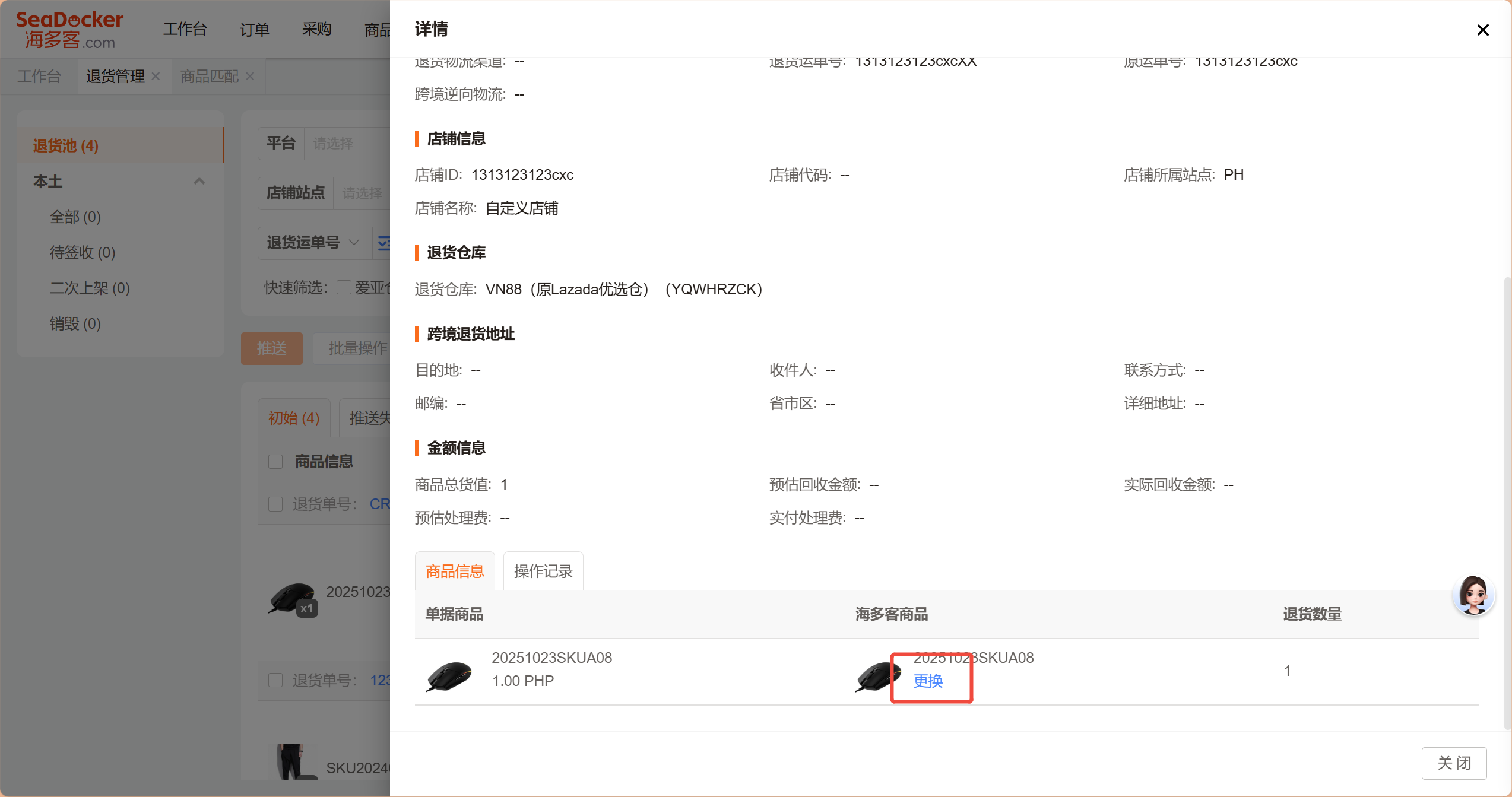 说明:更换要退货的【仓库SKU】,手动创建的退货单,支持【手动更换退货商品】。退货商品是【海多客SKU】。请确保更换的【海多客SKU】和【仓库SKU】已匹配成功。