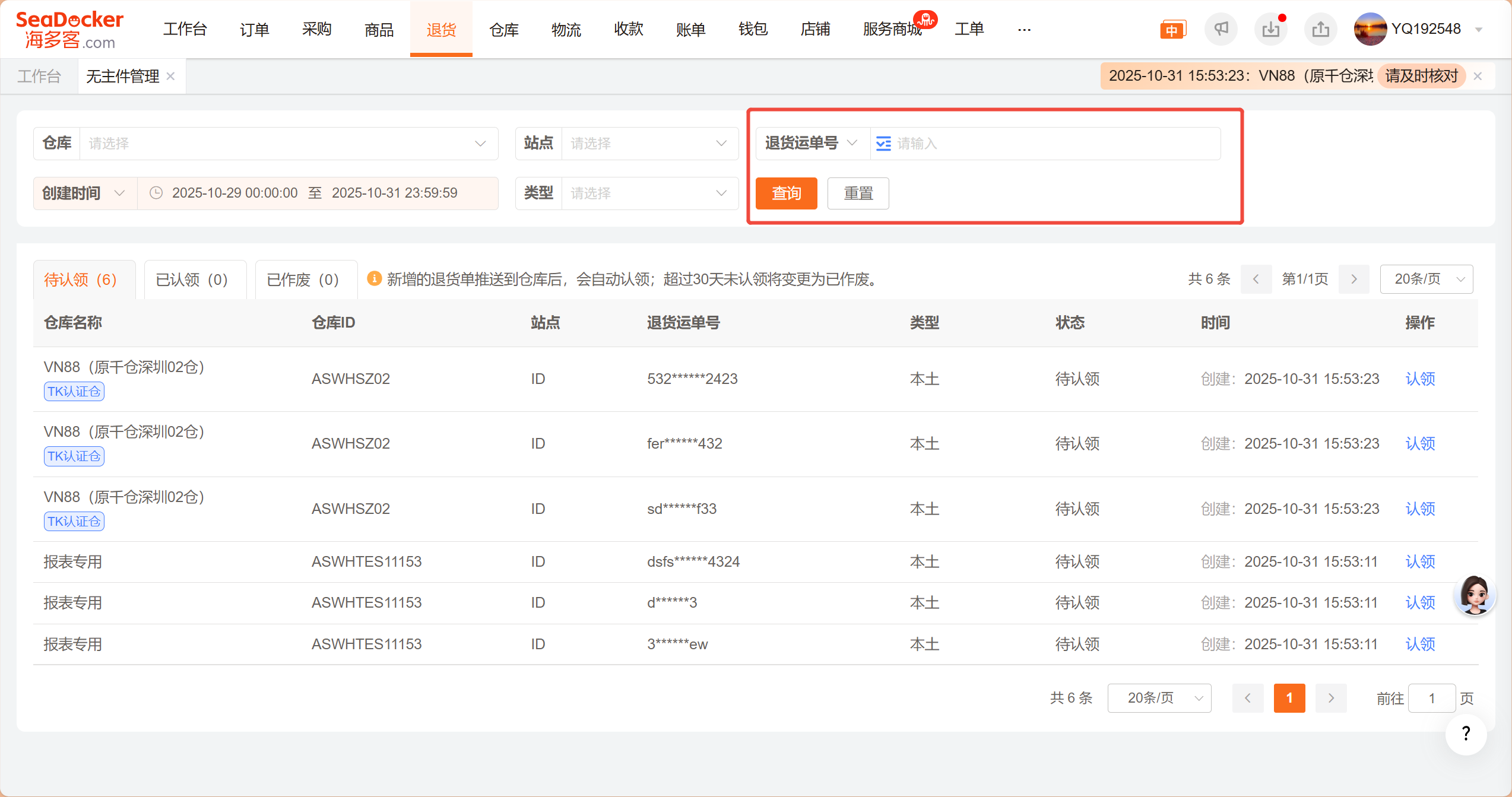 说明:因仓库每天有大量的退件。仓库相关人员识别退件归属客户比较困难。仓库负责人会定期在后台【登记】对应仓库的无主件。需要卖家认领。无人认领的无主件会在30天后自动作废。页面数据是来自所有客户的无主件。