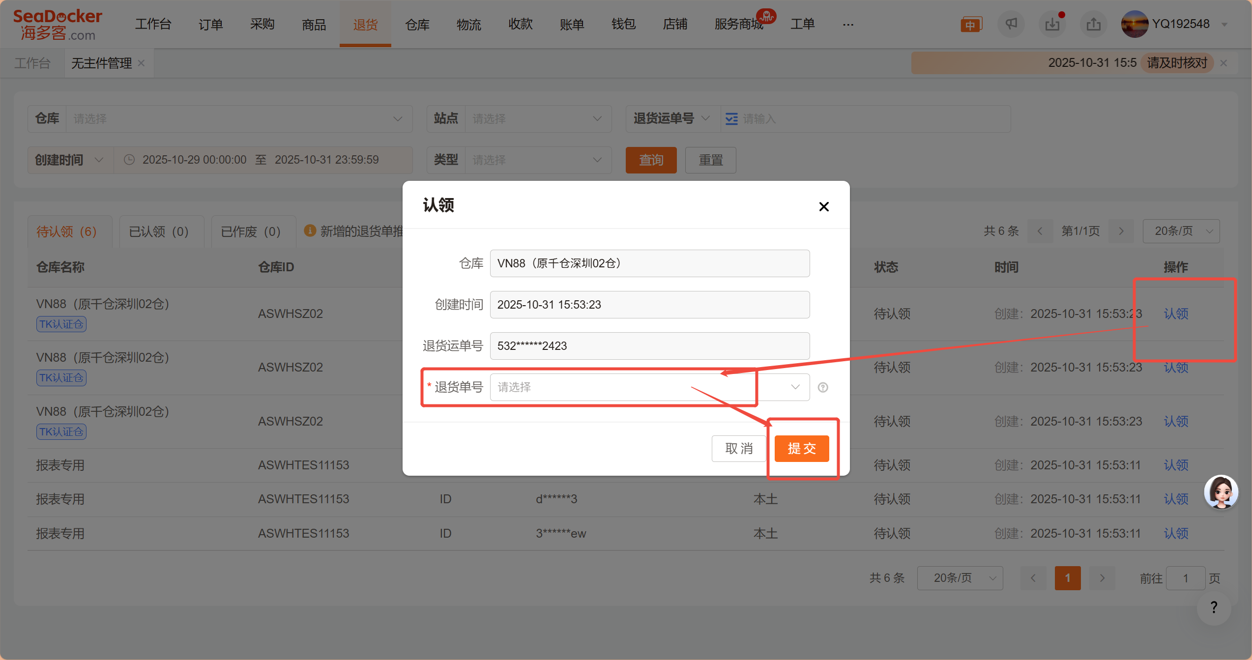 操作步骤:进入【无主件管理】页面,找到【认领】,点击【认领】。选择【退货单号】点击【提交】进行认领。