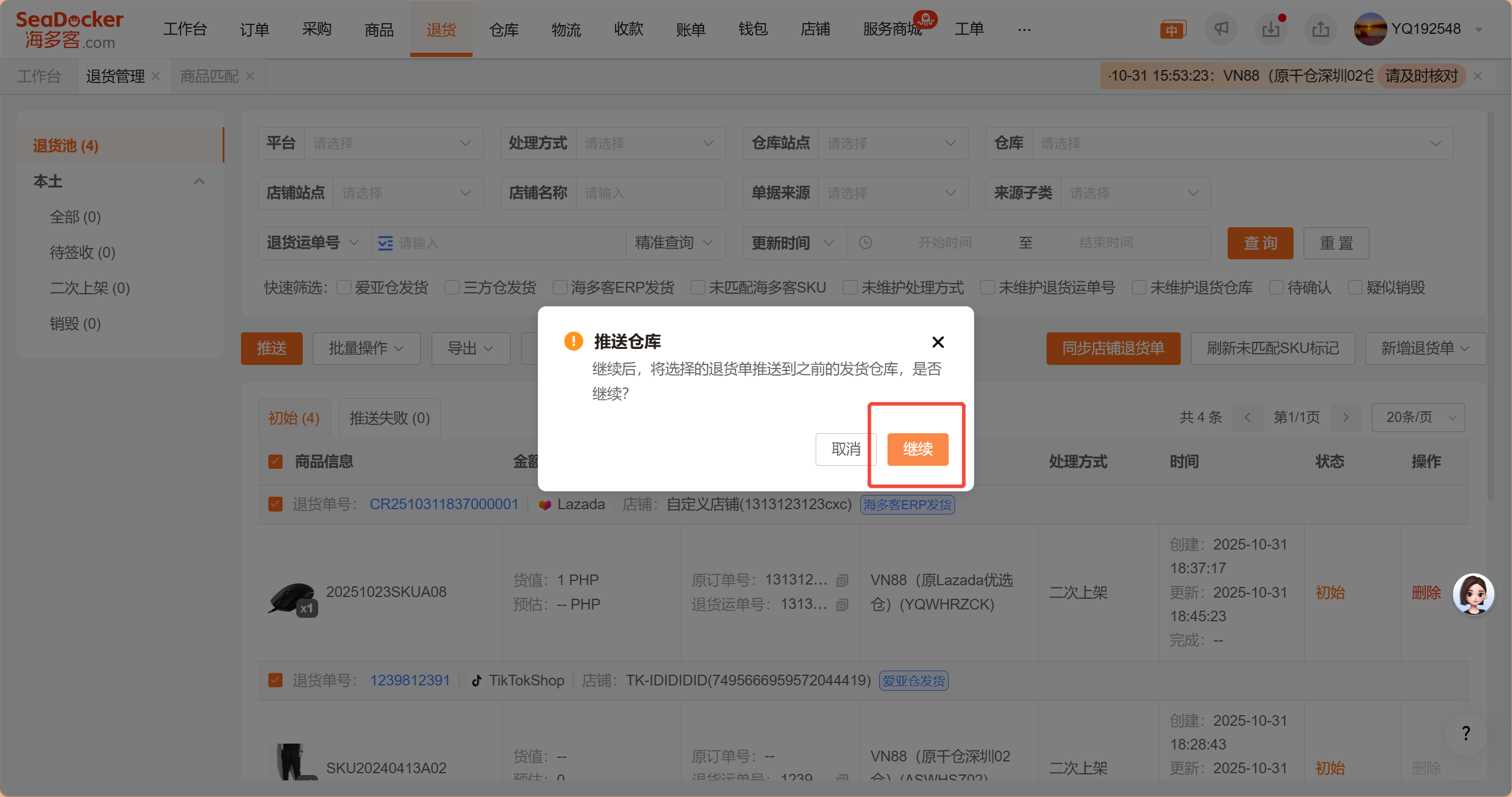 说明:此操作是将【退货单】推送至对应【仓库】中。如果推仓成功,退货单流转至【本土】,并按照【退货运单号】+【仓库】自动认领【无主件】。会存在推仓失败情况,如果推仓失败,请刷新页面,退货单右上角查【失败原因】。