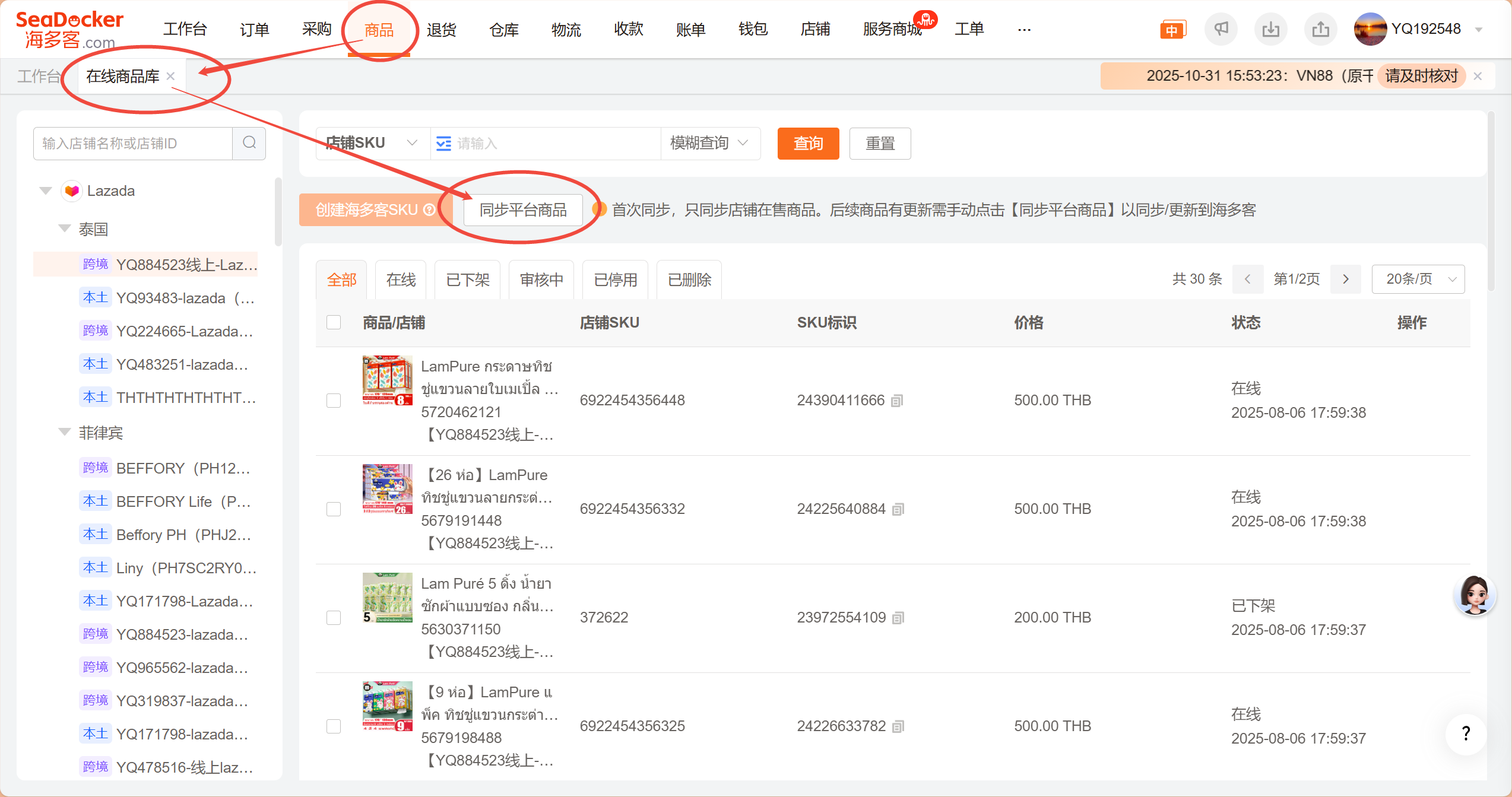 操作步骤:点击【商品】点击【在线商品库】点击【同步平台商品】