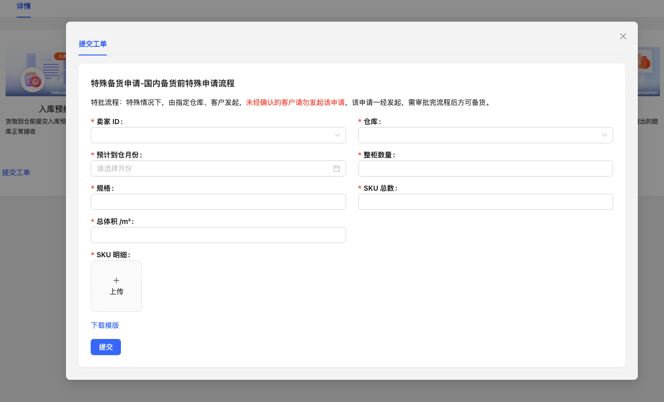 说明:特殊情况下,由指定仓库、客户发起,未经确认的客户请勿发起该申请,该申请一经发起,需审批完流程后方可备货;
