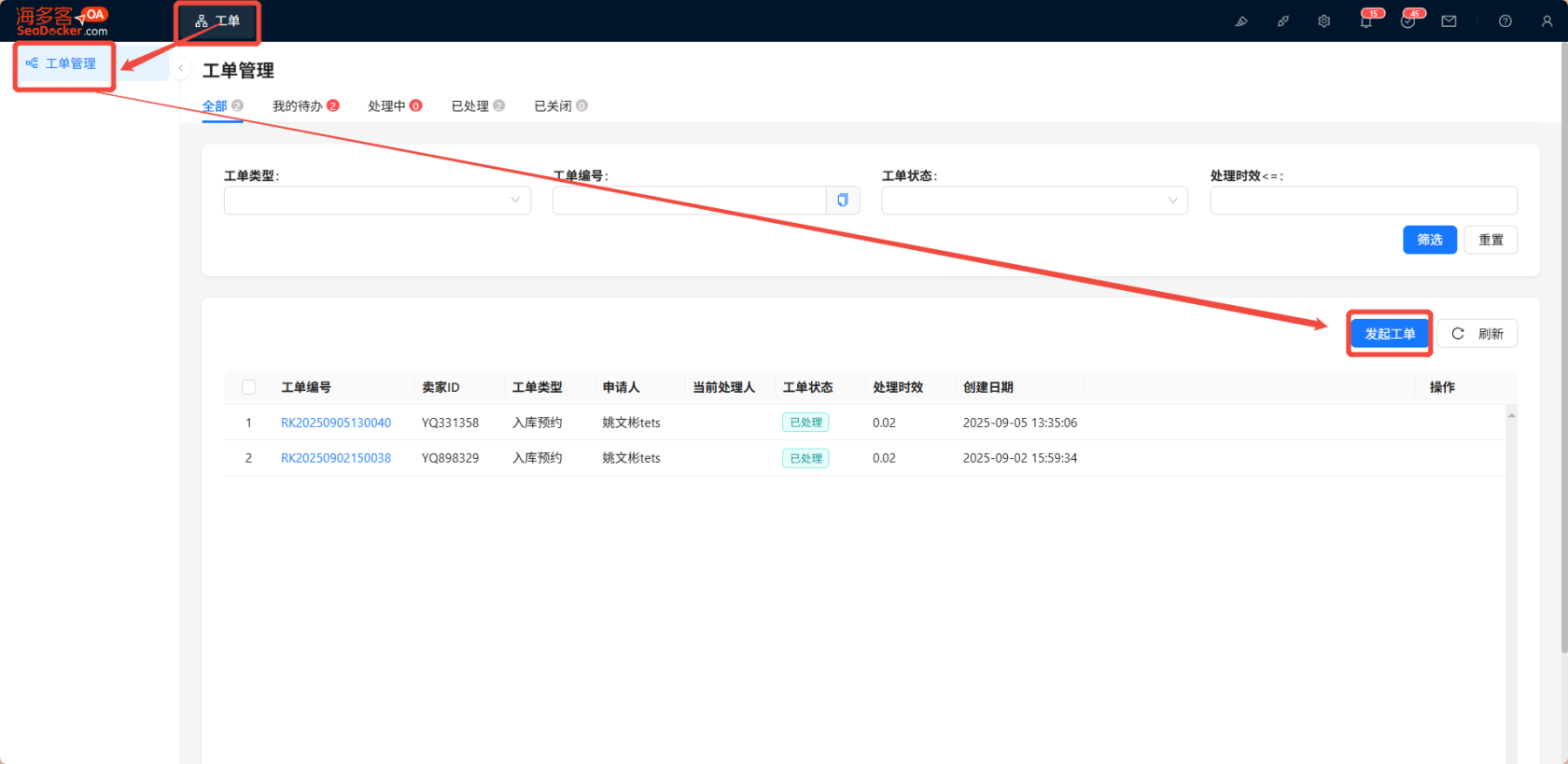 1、提交成功:在【工单-工单管理-全部tab】页面查看提交的数据和当前处理状态。