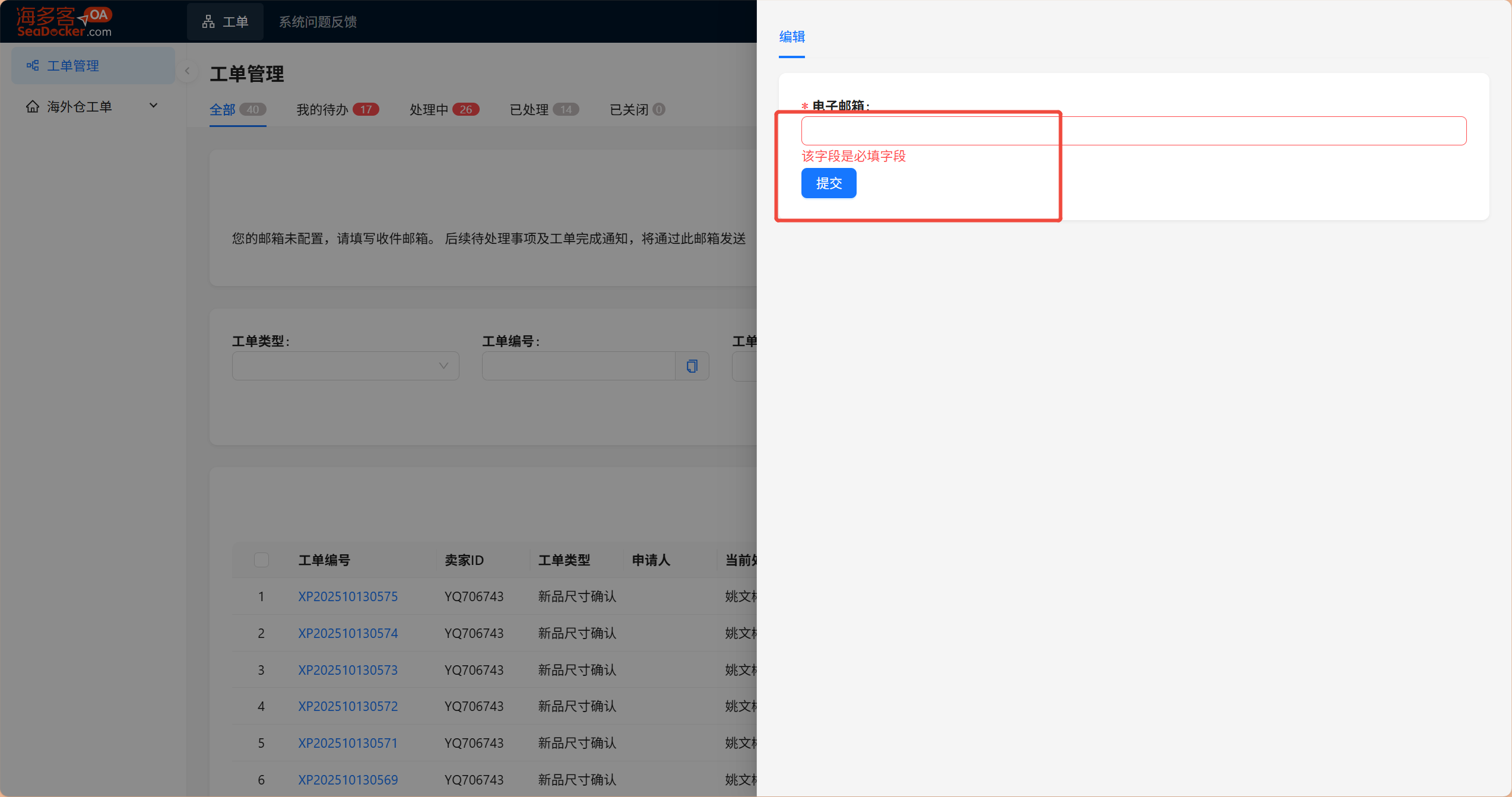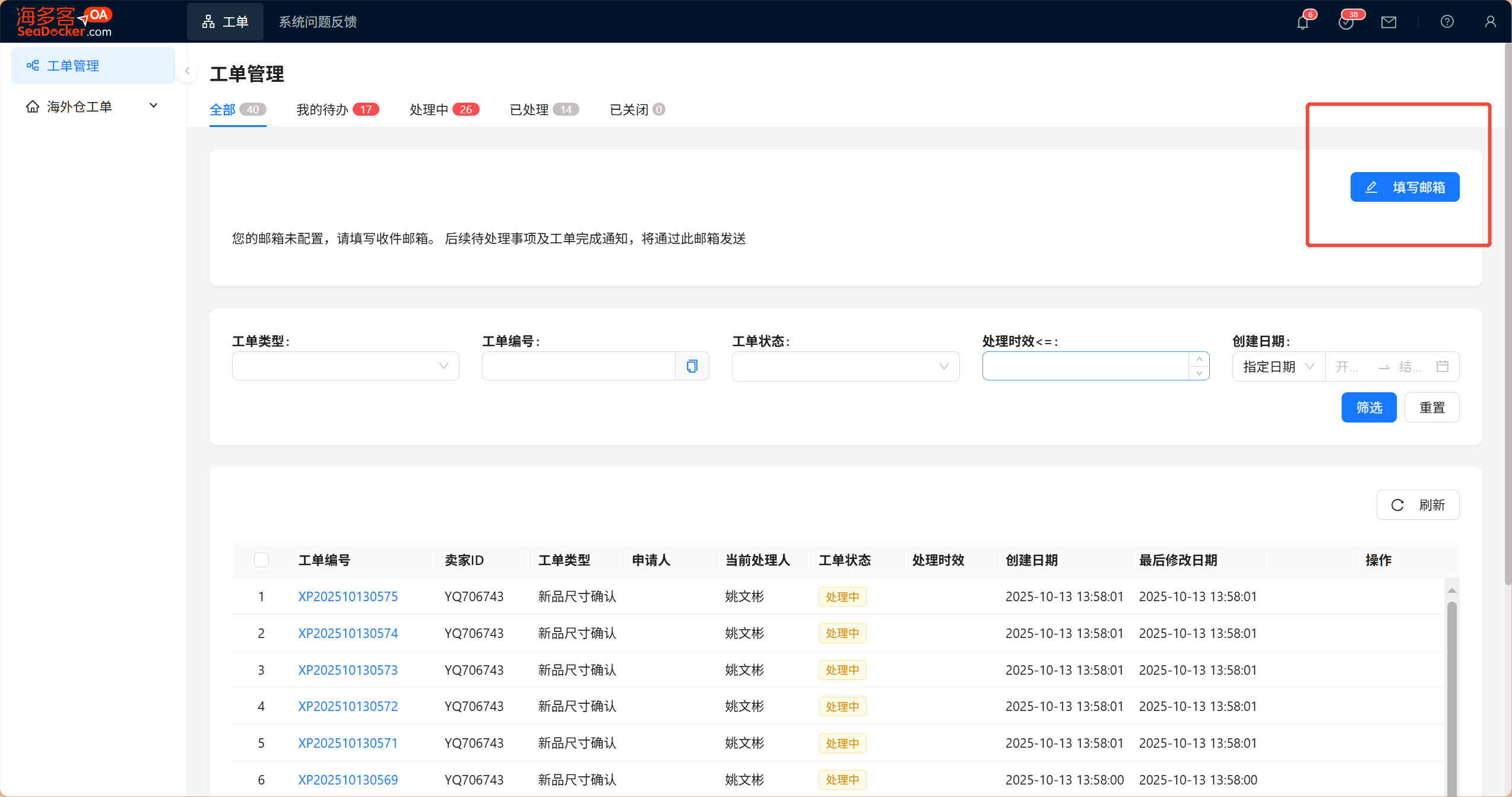 1,操作步骤:点击【工单】点击【工单管理】点击【填写邮箱】