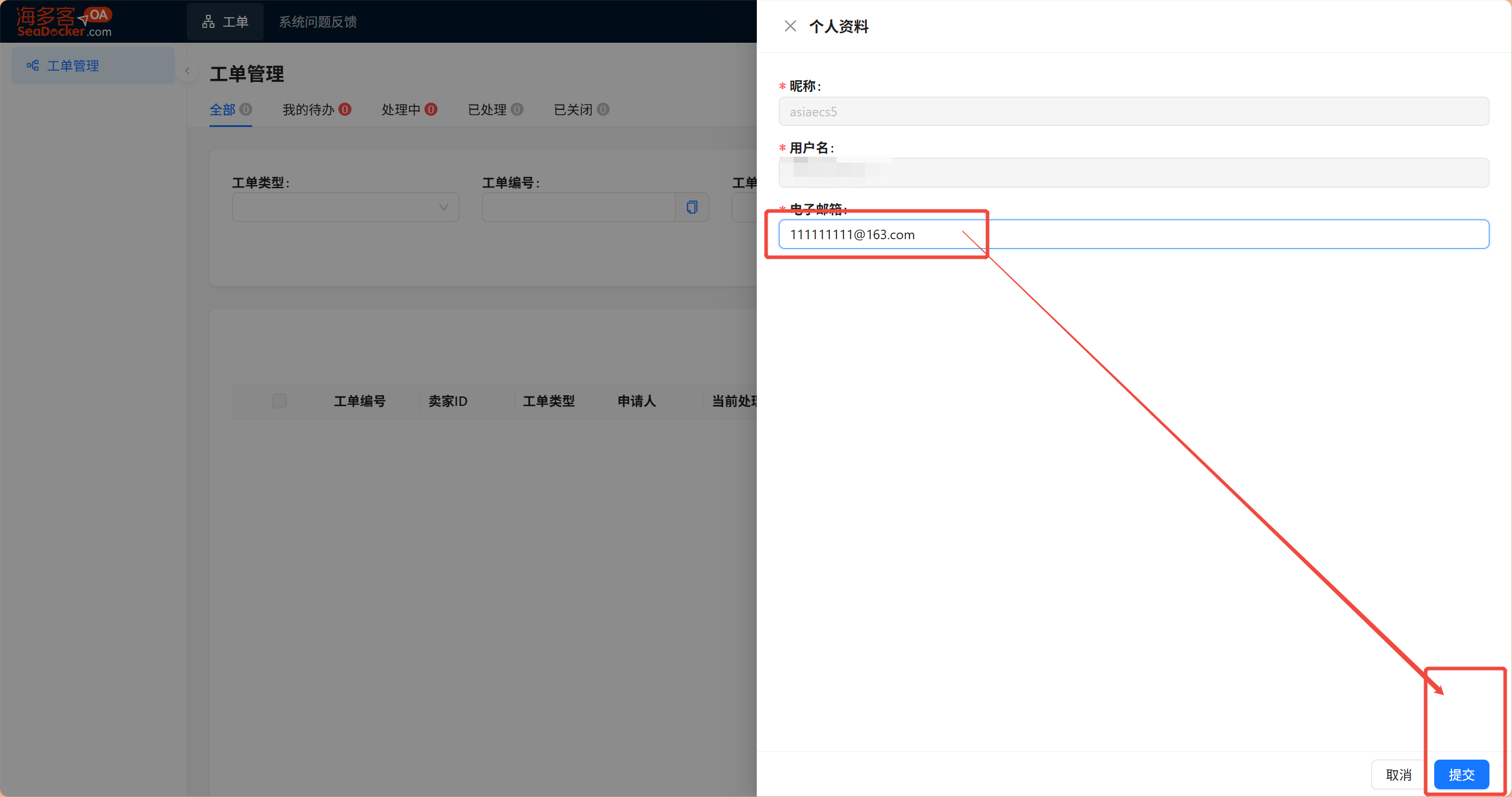 2,输入电子邮箱,必填,点击【提交】按钮进行提交即可。请输入正确的邮箱,否则无法接收到【工单状态】进度通知。