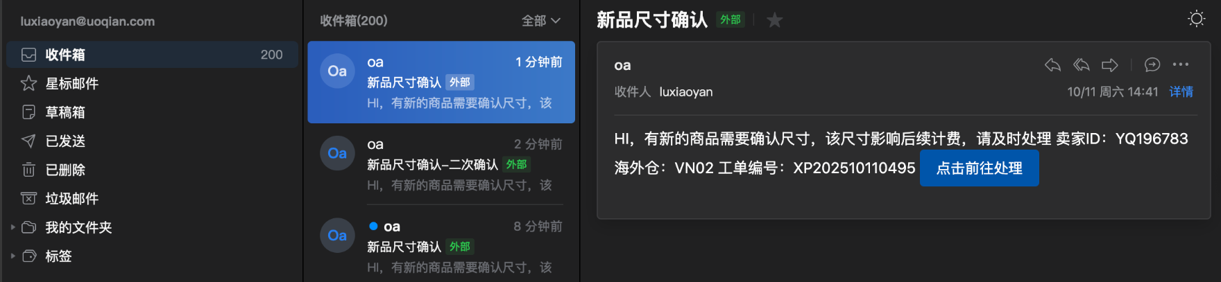 新品首次入仓,仓库测量尺寸后,次日9点生成工单,同时会通过邮件,发送消息通知