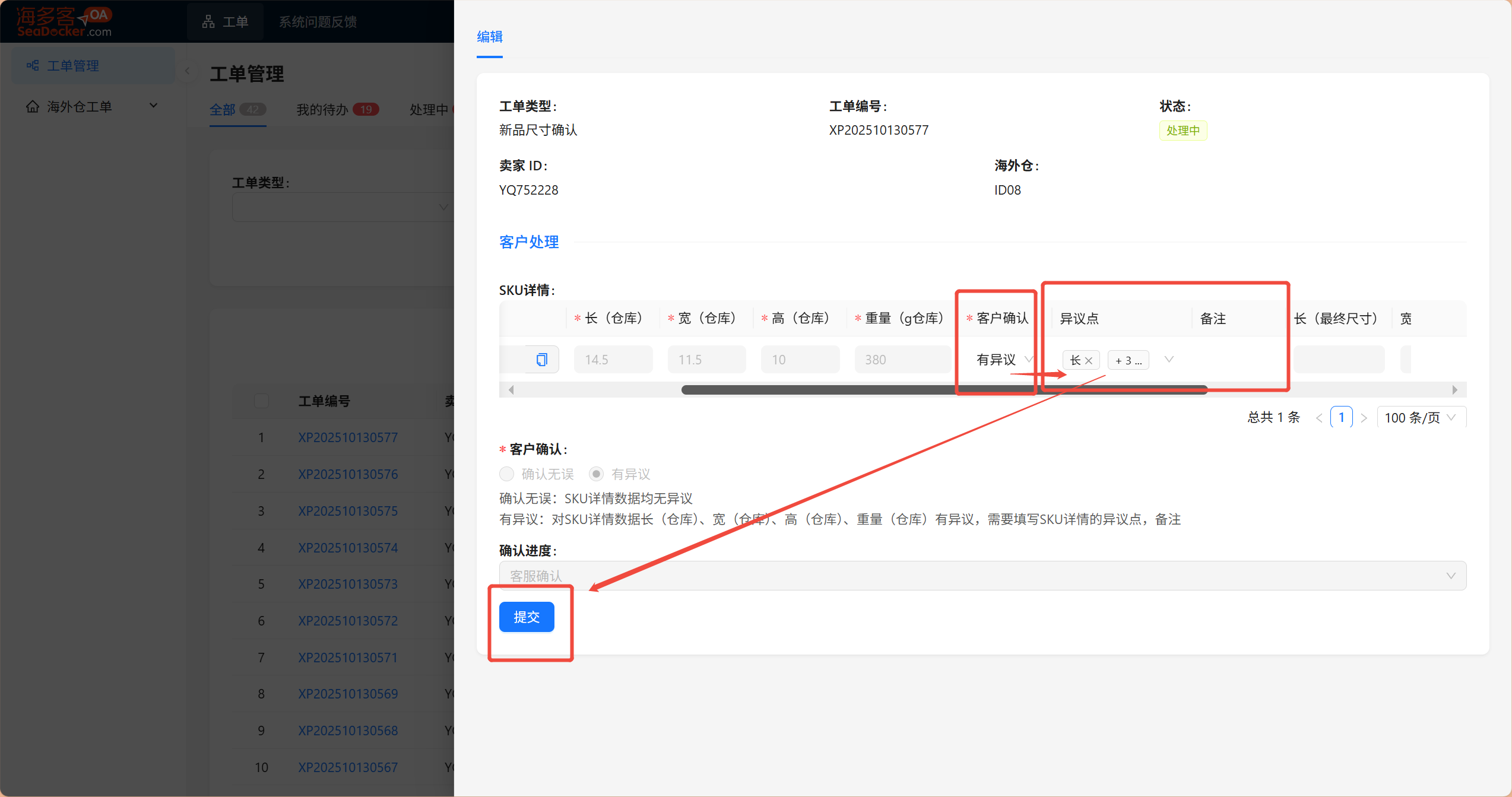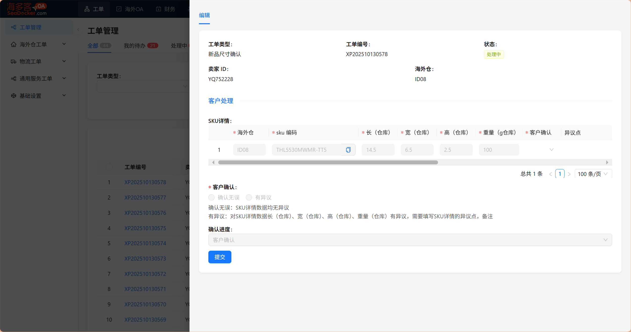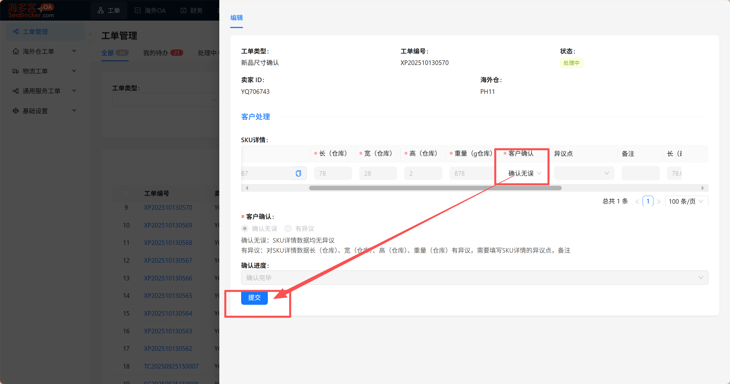 5,对【二次确认】的结果进行处理,点击【工单编号】点击【客户处理】。【客户二次确认】如果还有异议,选择【有异议】后,再次点击【提交】按钮提交,【二次确认备注】必填。提交成功后,由运营介入进行最终的长宽高重量信息确认。【客户二次确认】确认无误后,点击【提交】,提交后该【商品sku】长宽高重量信息表明双方(仓库和用户)都认可。