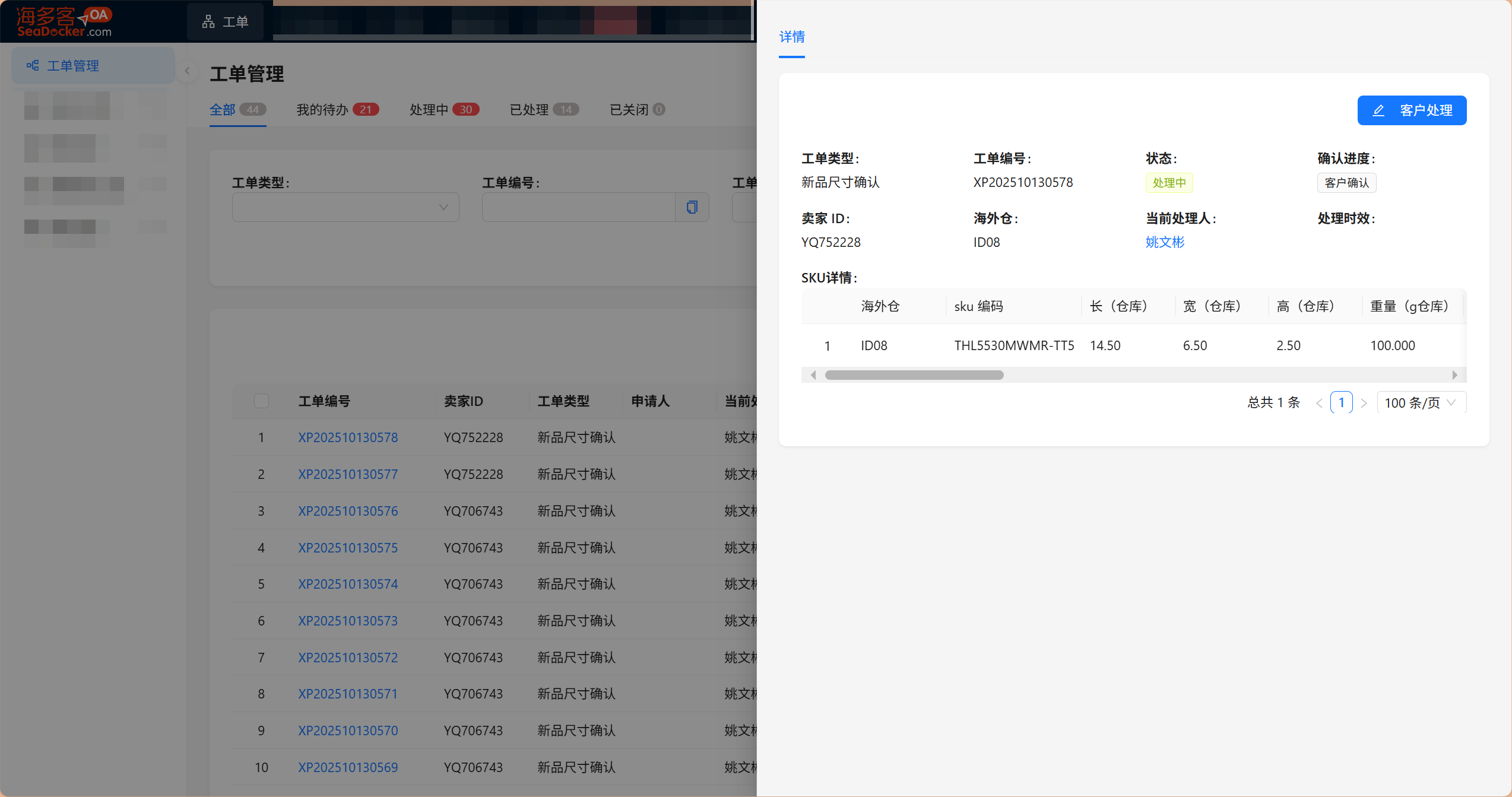 2,点击【客户处理】进入【商品sku】尺寸重量确认页面