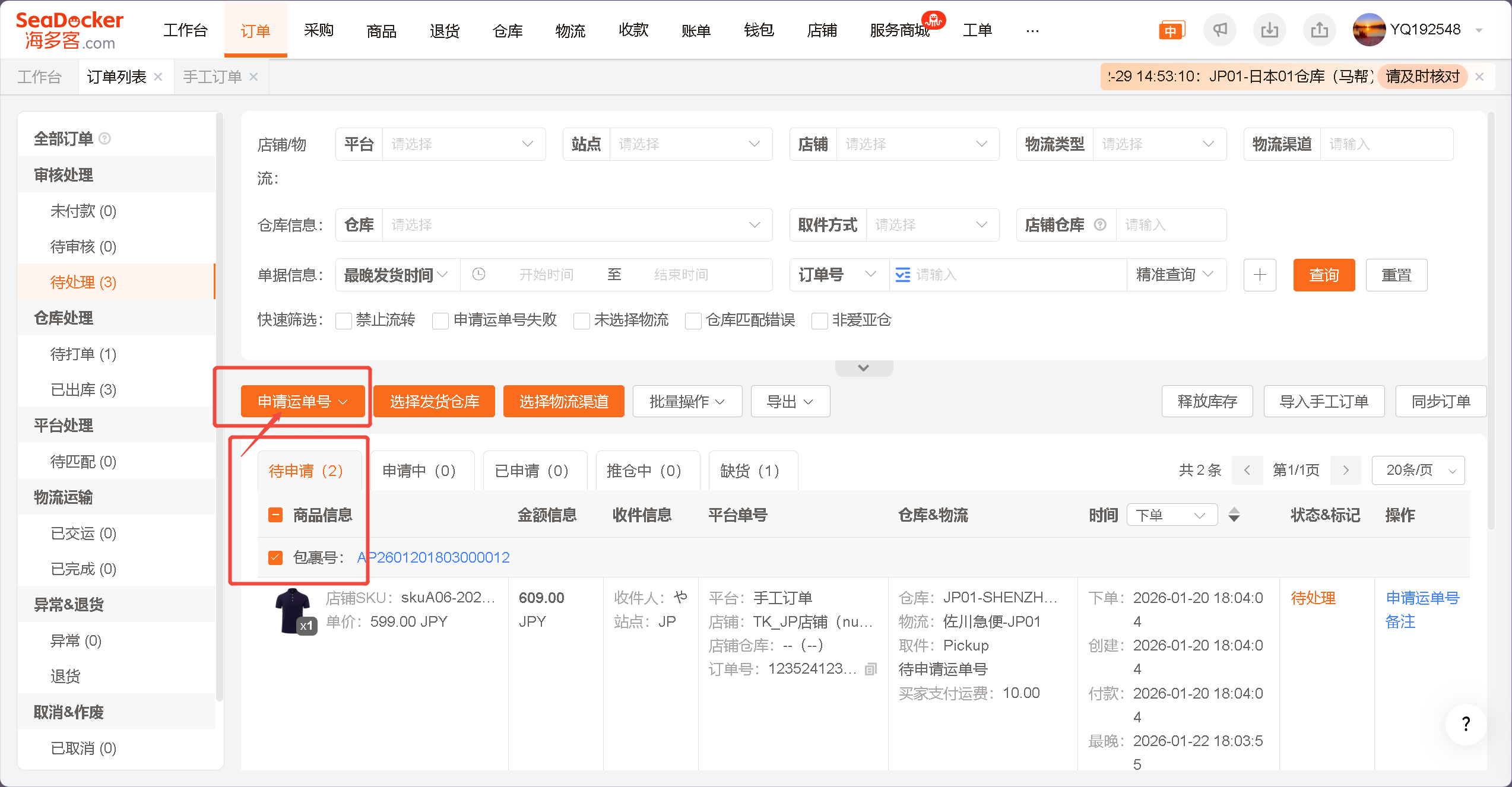 1,进入【待申请】tab,勾选订单,操作申请运单号