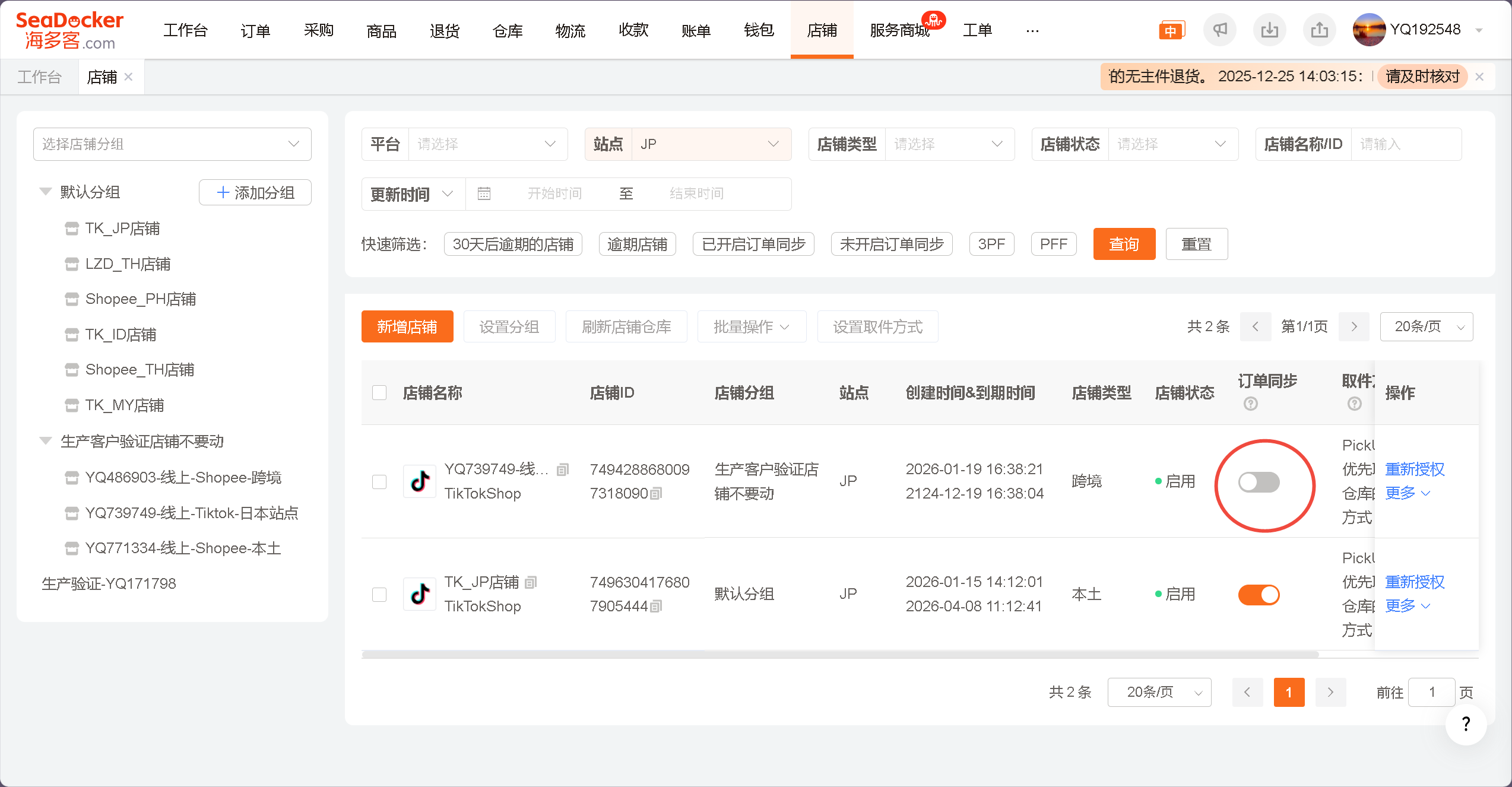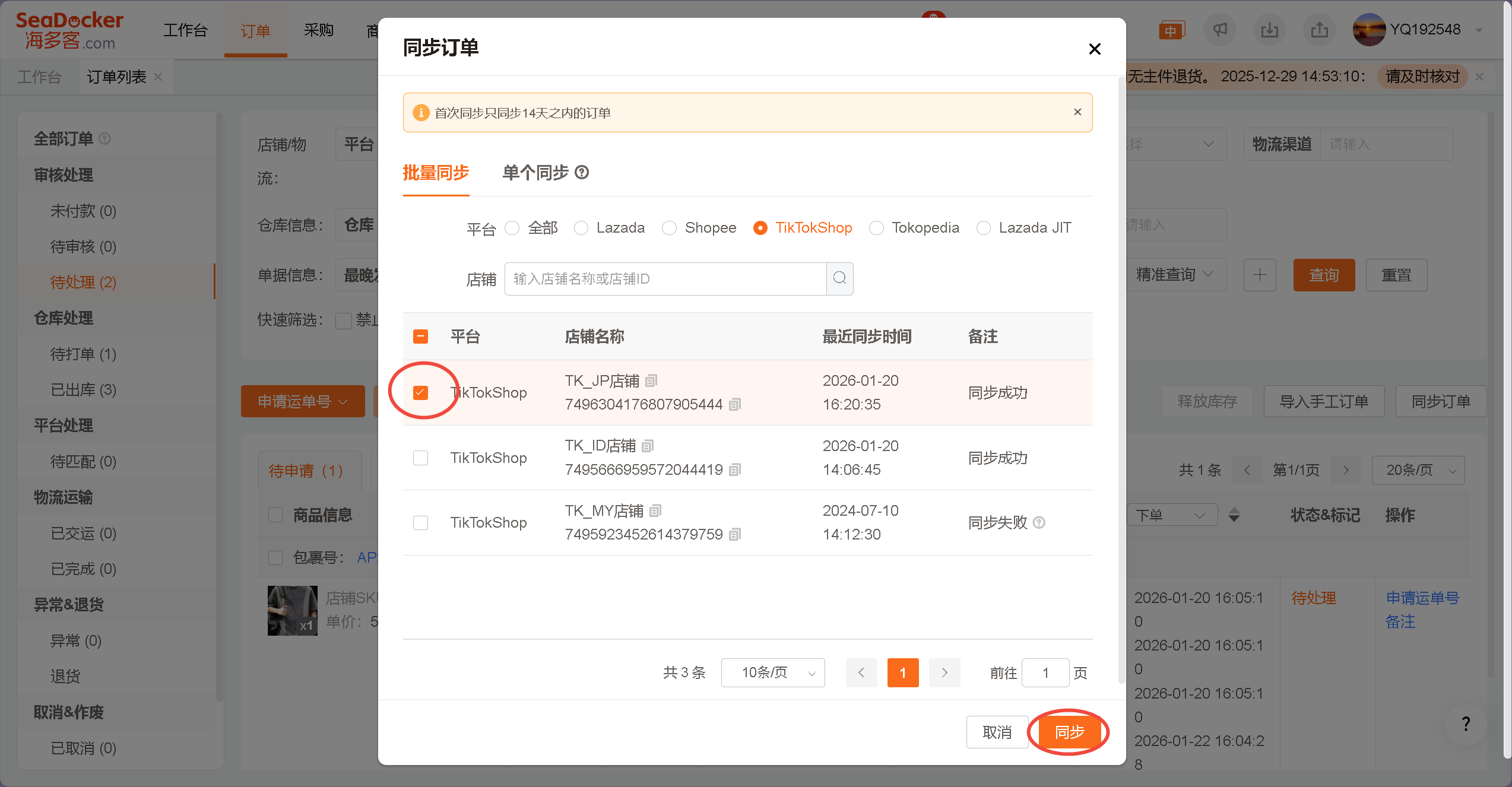 2,勾选TK平台JP站点店铺,点击【同步】按钮,即可同步店铺后台订单