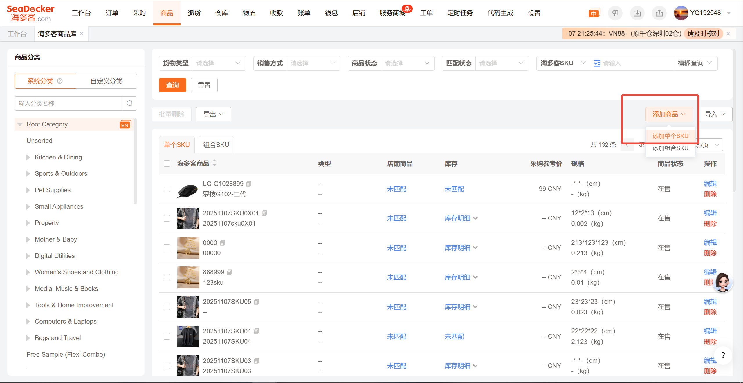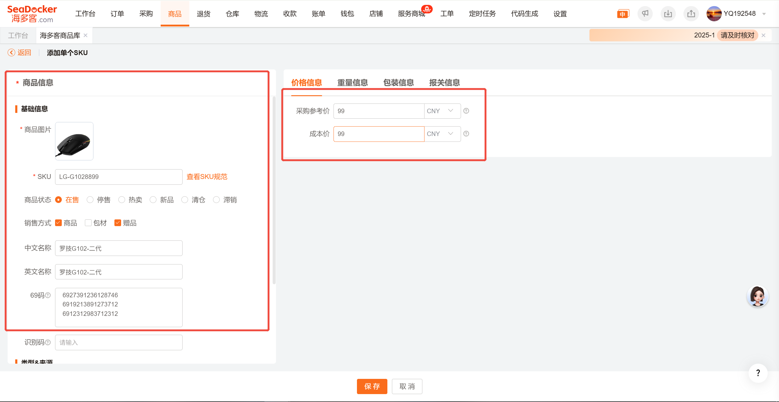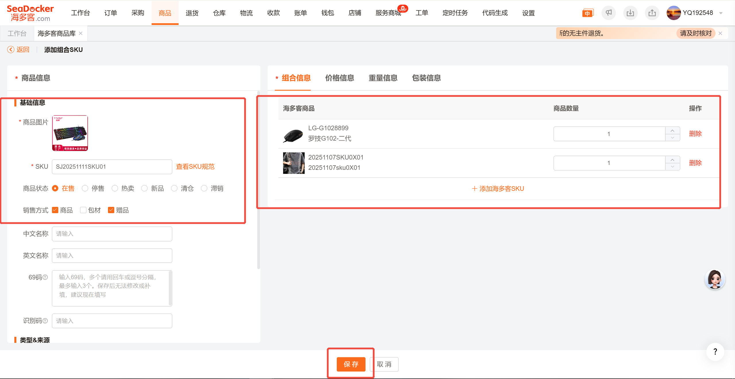 操作步骤:点击【添加商品】-【添加组合SKU】-填写【数据信息】-点击【保存】按钮